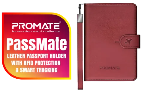 Promate PassMate Passport Holder - Burgundy / Premium Leather and Wear-Resistant Fiber / Works with Apple Find My / Built-In Speaker / RFID Protection / Wireless Rechargeable Battery / Bluetooth 5.2 / PassMate.Burgundy / PassMate.Burgundy