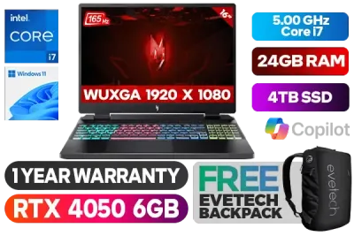 Acer Nitro 16 AN16-51-78P1 13th Gen Intel Core i7-13700H up to 5.00GHz Processor, 24MB Cache, 14x Cores, 20x Threads / 24GB DDR5 RAM / 4TB Ultra-Fast NVMe SSD / 16" WUXGA 1920x1200 Anit-Glare 165Hz IPS Slim Bezel Display / NVIDIA 40 Series GeForce RTX 4050 6GB GDDR6 Dedicated Graphics / Windows 11 Home (64bit) / Intel Killer AX1650i WiFi 6 Wireless Lan / Bluetooth 5.2 / 3x USB Type-A / 2x USB Type-C (Thunderbolt 4) / 1x HDMI / 1x Headphone and Microphone Audio Combo Jack / 1x RJ45 Ethernet Lan / 1x Micro SD Card Reader / HD 720p Webcam / RGB Backlit Keyboard/ 1 Year Warranty / Acer Nitro 16 Intel Core i7 RTX 4050 Gaming LaptopAcer Nitro 16 AN16-51-78P1 13th Gen Intel Core i7-13700H up to 5.00GHz Processor, 24MB Cache, 14x Cores, 20x Threads / 24GB DDR5 RAM / 4TB Ultra-Fast NVMe SSD / 16" WUXGA 1920x1200 Anit-Glare 165Hz IPS Slim Bezel Display / NVIDIA 40 Series GeForce RTX 4050 6GB GDDR6 Dedicated Graphics / Windows 11 Home (64bit) / Intel Killer AX1650i WiFi 6 Wireless Lan / Bluetooth 5.2 / 3x USB Type-A / 2x USB Type-C (Thunderbolt 4) / 1x HDMI / 1x Headphone and Microphone Audio Combo Jack / 1x RJ45 Ethernet Lan / 1x Micro SD Card Reader / HD 720p Webcam / RGB Backlit Keyboard/ 1 Year Warranty / Acer Nitro 16 Intel Core i7 RTX 4050 Gaming Laptop [NH.QJMEA.001/24GB/4TB] / [+] GET FREE EVETECH NEO Premium Gaming Backpack+ FREE DELIVERY !
