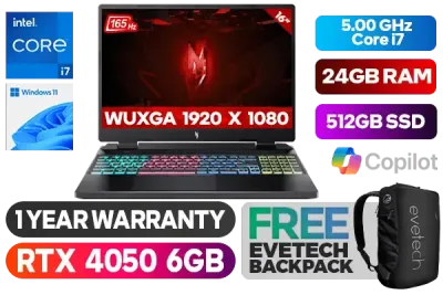 Acer Nitro 16 AN16-51-78P1 13th Gen Intel Core i7-13700H up to 5.00GHz Processor, 24MB Cache, 14x Cores, 20x Threads / 24GB DDR5 RAM / 512GB Ultra-Fast NVMe SSD / 16" WUXGA 1920x1200 Anit-Glare 165Hz IPS Slim Bezel Display / NVIDIA 40 Series GeForce RTX 4050 6GB GDDR6 Dedicated Graphics / Windows 11 Home (64bit) / Intel Killer AX1650i WiFi 6 Wireless Lan / Bluetooth 5.2 / 3x USB Type-A / 2x USB Type-C (Thunderbolt 4) / 1x HDMI / 1x Headphone and Microphone Audio Combo Jack / 1x RJ45 Ethernet Lan / 1x Micro SD Card Reader / HD 720p Webcam / RGB Backlit Keyboard/ 1 Year Warranty / Acer Nitro 16 Intel Core i7 RTX 4050 Gaming LaptopAcer Nitro 16 AN16-51-78P1 13th Gen Intel Core i7-13700H up to 5.00GHz Processor, 24MB Cache, 14x Cores, 20x Threads / 24GB DDR5 RAM / 512GB Ultra-Fast NVMe SSD / 16" WUXGA 1920x1200 Anit-Glare 165Hz IPS Slim Bezel Display / NVIDIA 40 Series GeForce RTX 4050 6GB GDDR6 Dedicated Graphics / Windows 11 Home (64bit) / Intel Killer AX1650i WiFi 6 Wireless Lan / Bluetooth 5.2 / 3x USB Type-A / 2x USB Type-C (Thunderbolt 4) / 1x HDMI / 1x Headphone and Microphone Audio Combo Jack / 1x RJ45 Ethernet Lan / 1x Micro SD Card Reader / HD 720p Webcam / RGB Backlit Keyboard/ 1 Year Warranty / Acer Nitro 16 Intel Core i7 RTX 4050 Gaming Laptop [NH.QJMEA.001/24GB] / [+] GET FREE EVETECH NEO Premium Gaming Backpack+ FREE DELIVERY !