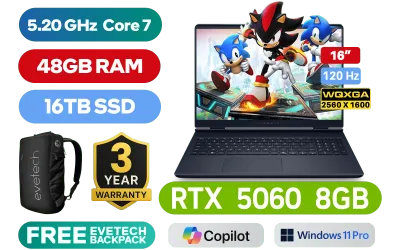 Alienware 16 Aurora AC16250 1625-5405 Intel® Core™ 7-240H up to 5.20GHz Processor, 24MB Cache, 10x Cores, 16x Threads / 48GB DDR5 RAM / 16TB Ultra-Fast NVME SSD / 16" WQXGA (2560 x 1600) 120Hz, Anti-Glare Display / NVIDIA 50 Series GeForce RTX 5060 8GB GDDR7 Graphics Card / 720p HD Camera / <span style="font-size: 20px; color: #00BFFF; font-weight: bold;">Windows 11 Professional (64bit)</span> / Realtek Wi-Fi 7 MT7925 Wireless LAN / Bluetooth 5.4 / Full Size White Backlit Keyboard / 2x USB Type-A / 2x USB Type-C (Display Port 1.4) / 1x HDMI 2.1 / RJ-45 Ethernet Port / 1x Microphone and Headphone Combo Jack / Realtek AL3204 Audio / Alienware 16 Aurora AC16250 Core 7 Laptop DealAlienware 16 Aurora AC16250 1625-5405 Intel® Core™ 7-240H up to 5.20GHz Processor, 24MB Cache, 10x Cores, 16x Threads / 48GB DDR5 RAM / 16TB Ultra-Fast NVME SSD / 16" WQXGA (2560 x 1600) 120Hz, Anti-Glare Display / NVIDIA 50 Series GeForce RTX 5060 8GB GDDR7 Graphics Card / 720p HD Camera / Windows 11 Professional (64bit) / Realtek Wi-Fi 7 MT7925 Wireless LAN / Bluetooth 5.4 / Full Size White Backlit Keyboard / 2x USB Type-A / 2x USB Type-C (Display Port 1.4) / 1x HDMI 2.1 / RJ-45 Ethernet Port / 1x Microphone and Headphone Combo Jack / Realtek AL3204 Audio / Alienware 16 Aurora AC16250 Core 7 Laptop Deal [NBDEAC16250C732111PE/48GB/16TB] / [+] GET FREE EVETECH NEO Premium Gaming Backpack / 3 YEARS WARRANTY + FREE DELIVERY !