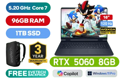 Alienware 16 Aurora AC16250 1625-5405 Intel® Core™ 7-240H up to 5.20GHz Processor, 24MB Cache, 10x Cores, 16x Threads / 96GB DDR5 RAM / 1TB Ultra-Fast NVME SSD / 16" WQXGA (2560 x 1600) 120Hz, Anti-Glare Display / NVIDIA 50 Series GeForce RTX 5060 8GB GDDR7 Graphics Card / 720p HD Camera / <span style="font-size: 20px; color: #00BFFF; font-weight: bold;">Windows 11 Professional (64bit)</span> / Realtek Wi-Fi 7 MT7925 Wireless LAN / Bluetooth 5.4 / Full Size White Backlit Keyboard / 2x USB Type-A / 2x USB Type-C (Display Port 1.4) / 1x HDMI 2.1 / RJ-45 Ethernet Port / 1x Microphone and Headphone Combo Jack / Realtek AL3204 Audio / Alienware 16 Aurora AC16250 Core 7 Laptop DealAlienware 16 Aurora AC16250 1625-5405 Intel® Core™ 7-240H up to 5.20GHz Processor, 24MB Cache, 10x Cores, 16x Threads / 96GB DDR5 RAM / 1TB Ultra-Fast NVME SSD / 16" WQXGA (2560 x 1600) 120Hz, Anti-Glare Display / NVIDIA 50 Series GeForce RTX 5060 8GB GDDR7 Graphics Card / 720p HD Camera / Windows 11 Professional (64bit) / Realtek Wi-Fi 7 MT7925 Wireless LAN / Bluetooth 5.4 / Full Size White Backlit Keyboard / 2x USB Type-A / 2x USB Type-C (Display Port 1.4) / 1x HDMI 2.1 / RJ-45 Ethernet Port / 1x Microphone and Headphone Combo Jack / Realtek AL3204 Audio / Alienware 16 Aurora AC16250 Core 7 Laptop Deal [NBDEAC16250C732111PE/96GB] / [+] GET FREE EVETECH NEO Premium Gaming Backpack / 3 YEARS WARRANTY + FREE DELIVERY !