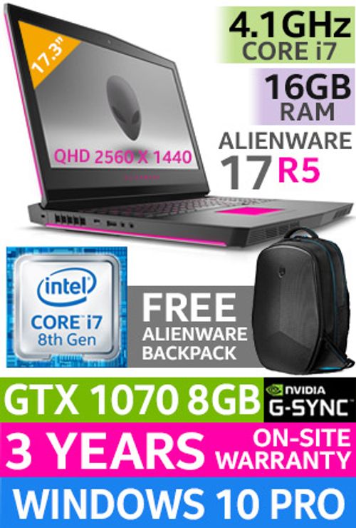 [<span style="font-size:18px; color:red;">G-SYNC QHD</span>] Alienware 17 R5 8th Gen Intel Core i7-8750H up to 4.1GHz Processor, 9MB Cache, 6x Cores, 12x Threads/ 16GB DDR4 RAM / 1TB High-Performance Hybrid SSHD with 8GB SSD Cache Hard Drive / 17.3" QHD (2560 x 1440) 120Hz Anti-Glare 400-nits NVIDIA G-SYNC with Tobii Eye-tracking Display / NVIDIA GeForce GTX 1070 8GB GDDR5 Graphics With Desktop Level Performance / <span style="color:red; font-size:18px;">Windows 10 Professional (64bit)</span> / Killer 1435 802.11ac Dual Band Wireless LAN / Killer e2500 Gigabit Ethernet / Alienware TactX Keyboard 4-Zone, multi-color RGB, keyboard with AlienFX lighting controls and numeric keypad / Alienware HD+IR presence detection Camera / Bluetooth 4.1 / 2x USB 3.0 / 1x Mini Display Port 1.2 / 1x HDMI 2.0 / 1x Thunderbolt 3 / 1x Alienware Graphics Amplifier Port / 1x USB 3.0 Type-C / AlienFX Lighting Zones / FREE Alienware Vindicator V2.0 17.3" High Quality Gaming Backpack / <span style="font-size:18px; color:blue;">DELL 3 YEAR NEXT DAY ON-SITE WARRANTY</span> / Alienware 17 R5 8th Gen Core i7 GTX 1070 Pro QHD Gaming Laptop[G-SYNC QHD] Alienware 17 R5 8th Gen Intel Core i7-8750H up to 4.1GHz Processor, 9MB Cache, 6x Cores, 12x Threads/ 16GB DDR4 RAM / 1TB High-Performance Hybrid SSHD with 8GB SSD Cache Hard Drive / 17.3" QHD (2560 x 1440) 120Hz Anti-Glare 400-nits NVIDIA G-SYNC with Tobii Eye-tracking Display / NVIDIA GeForce GTX 1070 8GB GDDR5 Graphics With Desktop Level Performance / Windows 10 Professional (64bit) / Killer 1435 802.11ac Dual Band Wireless LAN / Killer e2500 Gigabit Ethernet / Alienware TactX Keyboard 4-Zone, multi-color RGB, keyboard with AlienFX lighting controls and numeric keypad / Alienware HD+IR presence detection Camera / Bluetooth 4.1 / 2x USB 3.0 / 1x Mini Display Port 1.2 / 1x HDMI 2.0 / 1x Thunderbolt 3 / 1x Alienware Graphics Amplifier Port / 1x USB 3.0 Type-C / AlienFX Lighting Zones / FREE Alienware Vindicator V2.0 17.3" High Quality Gaming Backpack / DELL 3 YEAR NEXT DAY ON-SITE WARRANTY / Alienware 17 R5 8th Gen Core i7 GTX 1070 Pro QHD Gaming Laptop [5397184187715] + FREE DELIVERY !