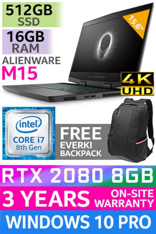 [<span style="font-size:18px; color:red;">4K</span>] Alienware M15 8th Gen Intel Core i7-8750H up to 4.1GHz Processor, 9MB Cache, 6x Cores, 12x Threads/ 16GB DDR4 RAM / 512GB Ultra-Fast SSD + 1TB High-Performance Hybrid SSHD with 8GB SSD Cache Hard Drive / 15.6" UHD (3840 x 2160) 400-nits, sRGB 100% color Gamut Narrow-Border Display / Latest 20 Series NVIDIA GeForce RTX 2080 8GB GDDR6 Graphics With Desktop Level Performance / <span style="color:red; font-size:18px;">Windows 10 Professional (64bit)</span> / 802.11ac Dual Band Wireless LAN / Killer Gigabit Ethernet / Alienware AlienFX mSeries keyboard with Alphanumeric Keys / Alienware FHD Camera / Bluetooth 4.2 / 2 SuperSpeed USB 3.1 Type A / 1 USB SuperSpeed 3.1 Type-A with Powershare Technology / 1x Thunderbolt 3 / 1x Alienware Graphics Amplifier Port / 1x HDMI 2.0 / 1x Mini Display Port 1.3 / 1x Audio Combo Jack / Alienware Sound Center and Audio Recon software / FREE EVERKI Swift Backpack / <span style="font-size:18px; color:blue;">DELL 3 YEAR NEXT DAY ON-SITE WARRANTY</span> / Alienware M15 8th Gen Core i7 RTX 2080 Pro Gaming Laptop[4K] Alienware M15 8th Gen Intel Core i7-8750H up to 4.1GHz Processor, 9MB Cache, 6x Cores, 12x Threads/ 16GB DDR4 RAM / 512GB Ultra-Fast SSD + 1TB High-Performance Hybrid SSHD with 8GB SSD Cache Hard Drive / 15.6" UHD (3840 x 2160) 400-nits, sRGB 100% color Gamut Narrow-Border Display / Latest 20 Series NVIDIA GeForce RTX 2080 8GB GDDR6 Graphics With Desktop Level Performance / Windows 10 Professional (64bit) / 802.11ac Dual Band Wireless LAN / Killer Gigabit Ethernet / Alienware AlienFX mSeries keyboard with Alphanumeric Keys / Alienware FHD Camera / Bluetooth 4.2 / 2 SuperSpeed USB 3.1 Type A / 1 USB SuperSpeed 3.1 Type-A with Powershare Technology / 1x Thunderbolt 3 / 1x Alienware Graphics Amplifier Port / 1x HDMI 2.0 / 1x Mini Display Port 1.3 / 1x Audio Combo Jack / Alienware Sound Center and Audio Recon software / FREE EVERKI Swift Backpack / DELL 3 YEAR NEXT DAY ON-SITE WARRANTY / Alienware M15 8th Gen Core i7 RTX 2080 Pro Gaming Laptop [AWM15-I7161T-2080/512GB] + FREE DELIVERY !