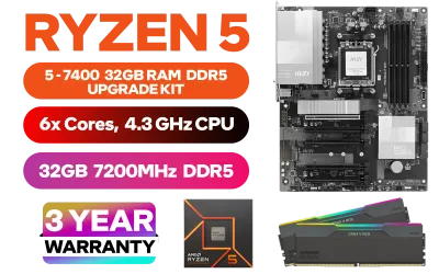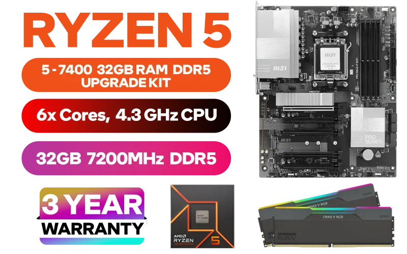 AMD RYZEN 5 7400 PRO B840-P 32GB DDR5 RGB 72000MHz Upgrade Kit - MSI Pro B840-P AMD Ryzen Motherboard + AMD RYZEN 5 7400 22MB GameCache Up to 4.3GHz CPU + KLEVV CRAS V 32GB Kit (16GB x2) 7200MHz Gaming Memory