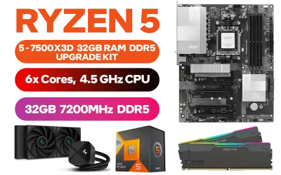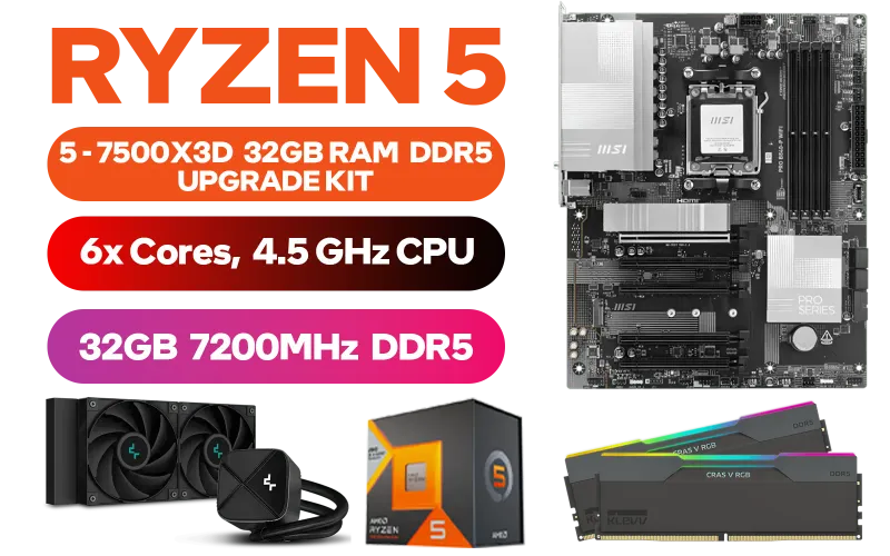 AMD RYZEN 5 7500X3D PRO B840-P 16GB DDR5 5600MHz Upgrade Kit - MSI Pro B840-P AMD Ryzen Motherboard + AMD RYZEN 5 7500X3D 102MB GameCache Up to 4.5GHz CPU + KLEVV CRAS V 32GB Kit (16GB x2) 7200MHz Gaming Memory + DeepCool LS520S Zero Dark Liquid Cooler