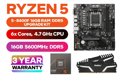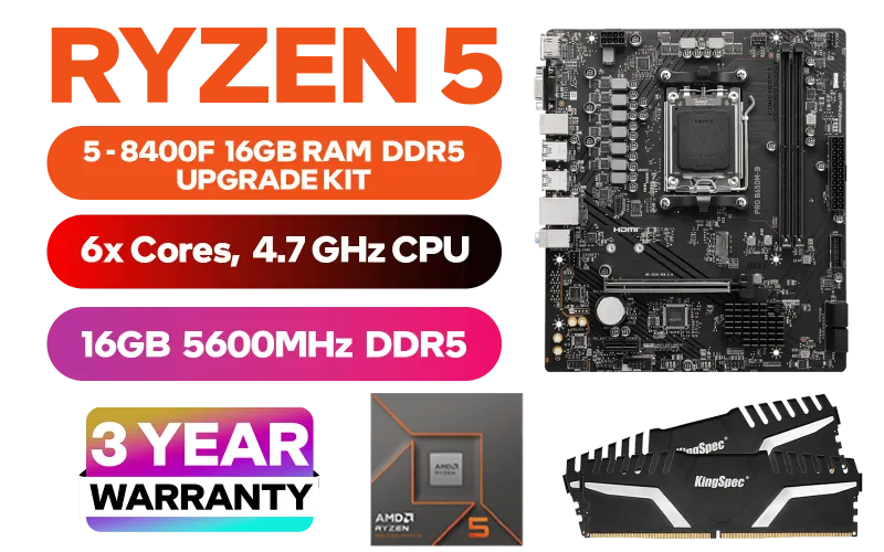 AMD RYZEN 5 8400F PRO B650M-B 16GB DDR5 5600MHz Upgrade Kit - MSI Pro B650M-B AMD Ryzen Motherboard + AMD RYZEN 5 8400F 19MB GameCache Up to 4.7GHz CPU (OEM No Packaging) + Kingspec 16GB Kit (16GB x1) 5600MHz Gaming Memory / Discrete GPU Required - No Integrated Graphics