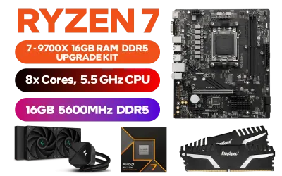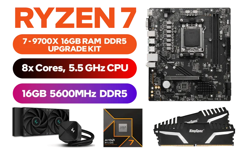 AMD RYZEN 7 9700X PRO B650M-B 16GB DDR5 5600MHz Upgrade Kit - MSI Pro B650M-B AMD Ryzen Motherboard + AMD RYZEN 7 9700X 40MB GameCache Up to 5.5GHz CPU (OEM No Packaging) + Kingspec 16GB Kit (16GB x1) 5600MHz Gaming Memory + DeepCool LS520S Zero Dark Liquid Cooler