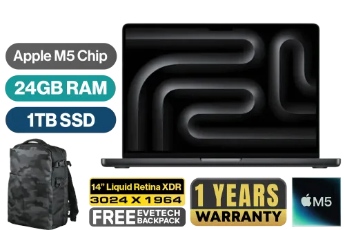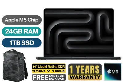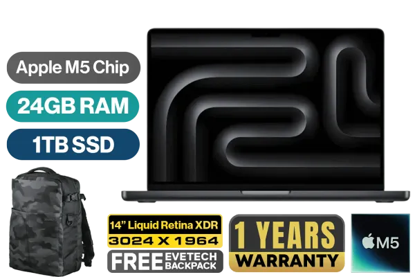 MacBook Pro 14" Apple M5 Chip with 10-Core CPU (4 Super Cores + 6 Efficiency Cores), 16-Core Neural Engine / 10-Core GPU with Neural Accelerators & Hardware-Accelerated Ray Tracing / 24GB Unified RAM / 1TB Ultra-Fast SSD / 14.2" Liquid Retina XDR (3024 x 1964) IPS Display / macOS with Apple Intelligence / 12MP Center Stage Camera with Desk View / Apple Wi-Fi 6E Wireless Chip / Bluetooth 5.3 / 3x USB Type-C (Thunderbolt 5) / 1x MagSafe 3 Charging Port [Charging Block not included] / 1x Microphone & Headphone Combo Jack / 1x HDMI / 1x SDXC Slot / 6-Speaker Sound System with Spatial Audio & Dolby Atmos / Touch ID / Backlit Magic Keyboard / 1-Year Warranty / MacBook Pro 14" M5 (1TB) - Space Black [MDE34ZE/A] / [+] GET FREE EVETECH DASH Premium Gaming Backpack+ FREE DELIVERY !
