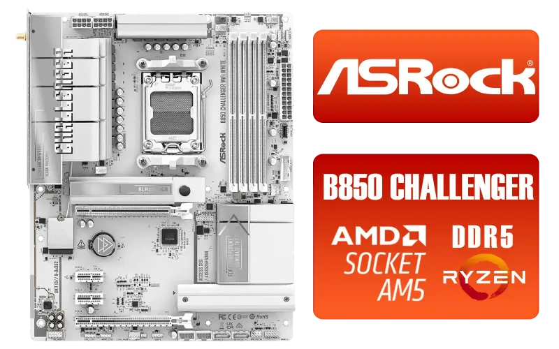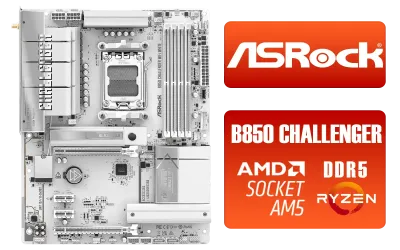 ASRock B850 Challenger WiFi AMD Motherboard - White / Supports AMD Socket AM5 Ryzen™ 9000, 8000 and 7000 Series Processors / AMD B850 Chipset / PCIe Gen5 (Graphics, M.2) / Dual Channel DDR5 / 90-MXBTF0-A0UAYZ