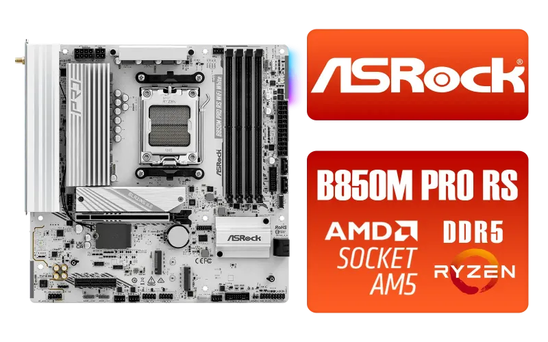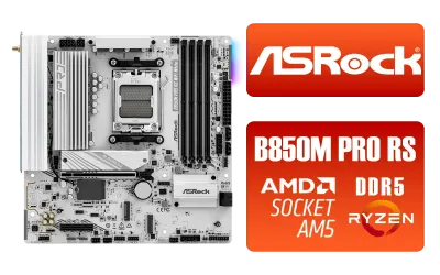ASRock B850M Pro RS WiFi AMD Motherboard - White / Supports AMD Socket AM5 Ryzen™ 9000, 8000 and 7000 Series Processors / AMD B850 Chipset / PCIe Gen5 (Graphics, M.2) / Dual Channel DDR5 / 8+2+1 Power Phase Dr.MOS for VCore+SOC+MISC / 2.5G LAN & Wi-Fi 6E / 90-MXBT30-A0UAYZ
