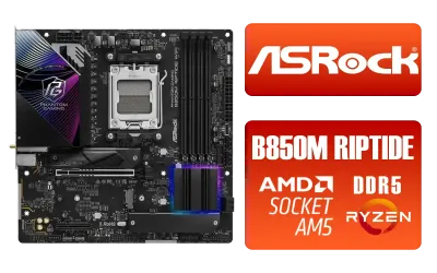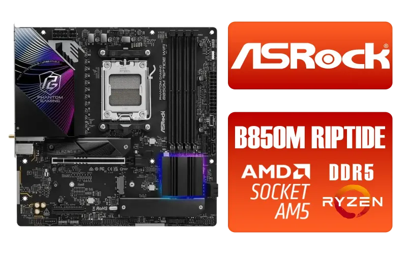 ASRock Phantom Gaming B850M Riptide WiFi AMD Motherboard / Supports AMD Socket AM5 Ryzen™ 9000, 8000 and 7000 Series Processors / AMD B850 Chipset / PCIe Gen5 (Graphics, M.2) / Dual Channel DDR5 / 90-MXBS30-A0UAYZ