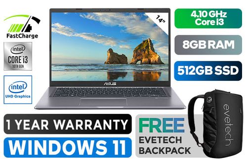 ASUS Laptop 14 X415FA Intel 10th Generation i3-10110U up to 4.10GHz, 4MB Cache Processor, 2x Cores, 4x Threads / 8GB DDR4 RAM / 512GB Ultra-Fast SSD / 14" FHD 1920 x 1080 Anti-Glare Display / Integrated Intel® UHD Graphics, DirectX 12 Support / No DVD Writer Included / Windows 11 Home (64bit) / 802.11ac Wireless LAN / Bluetooth 4.1 / VGA Web Camera / Non-Backlit chiclet keyboard / 1 x HDMI / 1 x USB Type-A / 2 x USB 2.0 / 1 x USB Type-C / ASUS SonicMaster Audio Technology / 1x Headphone-out & Audio-in Combo Jack / Fast Charging 60% in 49 mins / Ultra-light 1.5kg / 1 Year Warranty / ASUS 14 X415FA 10th Gen Core i3 Laptop DealASUS Laptop 14 X415FA Intel 10th Generation i3-10110U up to 4.10GHz, 4MB Cache Processor, 2x Cores, 4x Threads / 8GB DDR4 RAM / 512GB Ultra-Fast SSD / 14" FHD 1920 x 1080 Anti-Glare Display / Integrated Intel® UHD Graphics, DirectX 12 Support / No DVD Writer Included / Windows 11 Home (64bit) / 802.11ac Wireless LAN / Bluetooth 4.1 / VGA Web Camera / Non-Backlit chiclet keyboard / 1 x HDMI / 1 x USB Type-A / 2 x USB 2.0 / 1 x USB Type-C / ASUS SonicMaster Audio Technology / 1x Headphone-out & Audio-in Combo Jack / Fast Charging 60% in 49 mins / Ultra-light 1.5kg / 1 Year Warranty / ASUS 14 X415FA 10th Gen Core i3 Laptop Deal [X415FA-I38512G0W] / [+] GET FREE EVETECH NEO Premium Gaming Backpack+ FREE DELIVERY !