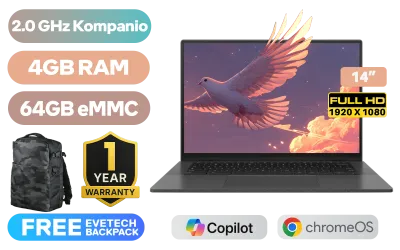 Asus Chromebook CM14 Kompanio 520 up to 2.0GHz Processor, 1MB Cache, 8x Cores / 4GB LPDDR4X RAM / 64GB eMMC / 14" FHD (1920 x 1080) Anti-Glare Display / Integrated ARM Mali-G52 MC2 Graphics / Chrome OS™ / MediaTek Wi-Fi 6 MT79215 Wireless LAN / Bluetooth 5.4 / 720P HD Camera with Privacy Shutter / 1 x USB Type-A / 2x USB Type-C / 1 x Headphone and Microphone Combo Jack / 1x MicroSD Card Reader / Standard Chicklet Keyboard / Built-In Speaker & Microphone / 1 Year Warranty / Asus Chromebook CM14 Kompanio Laptop DealAsus Chromebook CM14 Kompanio 520 up to 2.0GHz Processor, 1MB Cache, 8x Cores / 4GB LPDDR4X RAM / 64GB eMMC / 14" FHD (1920 x 1080) Anti-Glare Display / Integrated ARM Mali-G52 MC2 Graphics / Chrome OS™ / MediaTek Wi-Fi 6 MT79215 Wireless LAN / Bluetooth 5.4 / 720P HD Camera with Privacy Shutter / 1 x USB Type-A / 2x USB Type-C / 1 x Headphone and Microphone Combo Jack / 1x MicroSD Card Reader / Standard Chicklet Keyboard / Built-In Speaker & Microphone / 1 Year Warranty / Asus Chromebook CM14 Kompanio Laptop Deal [CM1402CM2A-NK0242] / [+] GET FREE EVETECH DASH Premium Gaming Backpack+ FREE DELIVERY !