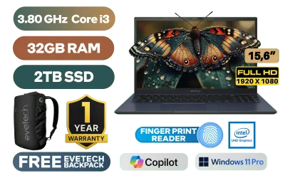 Asus ExpertBook B1 B1502CGA Intel Core i3-N305 up to 3.80GHz Processor, 6MB Cache, 8x Cores, 8x Threads / 32GB DDR4 RAM / 2TB Ultra-Fast NVMe SSD / 15.6" FHD 1920 x 1080 Anti-Glare Display / Integrated Intel® UHD Graphics / <span style="font-size: 20px; color: #00BFFF; font-weight: bold;">Windows 11 Professional (64bit)</span> / No DVD Writer Included / Intel® Wi-Fi 6 Wireless LAN / Bluetooth 5.2 / 720p HD camera / 1x USB-A 2.0 / 1x USB-A 3.2 / 2 x USB 3.2 Type-C / 1x HDMI 1.4 / 1 x Headphone & Microphone Audio Combo Jack / 1x RJ45 / Chiclet Keyboard / Fingerprint Reader / 1 Year Warranty / Asus ExpertBook B1 Core i3 Laptop DealAsus ExpertBook B1 B1502CGA Intel Core i3-N305 up to 3.80GHz Processor, 6MB Cache, 8x Cores, 8x Threads / 32GB DDR4 RAM / 2TB Ultra-Fast NVMe SSD / 15.6" FHD 1920 x 1080 Anti-Glare Display / Integrated Intel® UHD Graphics / Windows 11 Professional (64bit) / No DVD Writer Included / Intel® Wi-Fi 6 Wireless LAN / Bluetooth 5.2 / 720p HD camera / 1x USB-A 2.0 / 1x USB-A 3.2 / 2 x USB 3.2 Type-C / 1x HDMI 1.4 / 1 x Headphone & Microphone Audio Combo Jack / 1x RJ45 / Chiclet Keyboard / Fingerprint Reader / 1 Year Warranty / Asus ExpertBook B1 Core i3 Laptop Deal [B1502CGA-I382B1X/32GB/2TB] / [+] GET FREE EVETECH NEO Premium Gaming Backpack+ FREE DELIVERY !