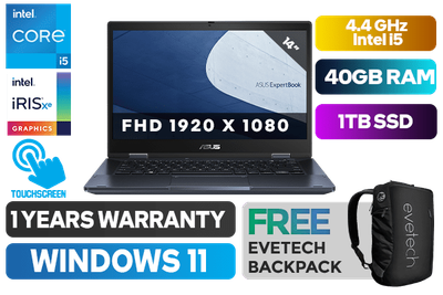 [TOUCHSCREEN] ASUS Expertbook B3 Flip B3402FBA 12th Gen Intel Tiger Lake Core i5-1235U up to 4.4GHz Processor, 12MB Cache, 10x Cores, 12x Threads / 40GB DDR4 RAM / 1TB Ultra-Fast NVMe SSD / 14" FHD 1920 x 1080 Wide view Glossy Display With Touch Screen / Integrated INTEL® UHD GRAPHICS / Windows 11 Professional (64bit) / No DVD Writer Included / Intel® Wi-Fi 6 AX201 Wireless LAN / Bluetooth 5.3 / 720p HD Camera with IR Function / 1x USB-A 2.0 / 1x USB-A 3.2 / 2x USB Type-C Thunderbolt™ 4, compliant with USB4, supports display & power delivery / 1x HDMI / 1 x Headphone & Microphone Audio Combo Jack / White Backlit Chiclet Keyboard / Fingerprint Reader / Free Stylus Included / 1 Year Warranty / ASUS Expertbook B3 Flip B3402FBA Core i5 Laptop Deal[TOUCHSCREEN] ASUS Expertbook B3 Flip B3402FBA 12th Gen Intel Tiger Lake Core i5-1235U up to 4.4GHz Processor, 12MB Cache, 10x Cores, 12x Threads / 40GB DDR4 RAM / 1TB Ultra-Fast NVMe SSD / 14" FHD 1920 x 1080 Wide view Glossy Display With Touch Screen / Integrated INTEL® UHD GRAPHICS / Windows 11 Professional (64bit) / No DVD Writer Included / Intel® Wi-Fi 6 AX201 Wireless LAN / Bluetooth 5.3 / 720p HD Camera with IR Function / 1x USB-A 2.0 / 1x USB-A 3.2 / 2x USB Type-C Thunderbolt™ 4, compliant with USB4, supports display & power delivery / 1x HDMI / 1 x Headphone & Microphone Audio Combo Jack / White Backlit Chiclet Keyboard / Fingerprint Reader / Free Stylus Included / 1 Year Warranty / ASUS Expertbook B3 Flip B3402FBA Core i5 Laptop Deal [B3402FBA-I58512G0X/40GB/1TB] / [+] GET FREE EVETECH NEO Premium Gaming Backpack+ FREE DELIVERY !