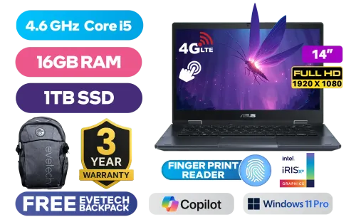 [TOUCHSCREEN] [4G LTE] ASUS ExpertBook B3 Flip B3402FVA 13th Gen Intel Core i5-1335U up to 4.6GHz Processor, 12MB Cache, 10x Cores, 12x Threads / 16GB DDR4 RAM / 1TB Ultra-Fast NVMe SSD / 14" FHD (1920 x 1080) Glossy Touchscreen Display / Integrated Intel Iris Xe Graphics / <span style="font-size: 20px; color: #00BFFF; font-weight: bold;">Windows 11 Professional (64bit)</span> / Fingerprint Reader / Intel® Wi-Fi 6E Wireless LAN / Bluetooth 5.3 / 720p HD Camera / 2x USB Type-A / 2x USB Type-C Thunderbolt™ 4, (USB4, supports display & power delivery) / 1x HDMI / 1 x Headphone & Microphone Audio Combo Jack / 1x RJ45 / MicroSD Card Reader + Nano SIM Combo / White Backlit Chiclet Keyboard / Free Stylus Included / ASUS ExpertBook B3 Flip B3402FVA Core i5 Laptop Deal[TOUCHSCREEN] [4G LTE] ASUS ExpertBook B3 Flip B3402FVA 13th Gen Intel Core i5-1335U up to 4.6GHz Processor, 12MB Cache, 10x Cores, 12x Threads / 16GB DDR4 RAM / 1TB Ultra-Fast NVMe SSD / 14" FHD (1920 x 1080) Glossy Touchscreen Display / Integrated Intel Iris Xe Graphics / Windows 11 Professional (64bit) / Fingerprint Reader / Intel® Wi-Fi 6E Wireless LAN / Bluetooth 5.3 / 720p HD Camera / 2x USB Type-A / 2x USB Type-C Thunderbolt™ 4, (USB4, supports display & power delivery) / 1x HDMI / 1 x Headphone & Microphone Audio Combo Jack / 1x RJ45 / MicroSD Card Reader + Nano SIM Combo / White Backlit Chiclet Keyboard / Free Stylus Included / ASUS ExpertBook B3 Flip B3402FVA Core i5 Laptop Deal [B3402FVA-I516512B1X/1TB] / 3 YEARS WARRANTY / [+] GET FREE EVETECH FLUX Premium Gaming Backpack+ FREE DELIVERY !