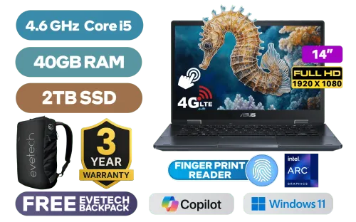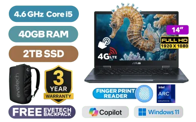 [TOUCHSCREEN] ASUS Expertbook B3 Flip B3402FVA 13th Gen Intel® Core™ i5-1335U up to 4.6GHz Processor, 12MB Cache, 10x Cores, 12x Threads / 40GB DDR4 RAM / 2TB Ultra-Fast NVMe SSD / 14" FHD 1920 x 1080 Wide view Glossy Display With Touch Screen / Integrated Intel® Iris® Xe Graphics / Windows 11 Home (64bit) / Intel AV Stream Camera + HD UVC Webcam / Intel® Wi-Fi 6 AX201 Wireless LAN / Bluetooth 5.3 / 2x USB-A / 2x USB Type-C / 1x HDMI / 1 x Headphone & Microphone Audio Combo Jack / 1x RJ45 / Volume Up & Down Button / Pen Bay / Standard Keyboard With Copilot Key / Fingerprint Reader / Free Asus Stylus Included(On the Laptop Body) / ASUS Expertbook B3 Flip B3402FVA Core i5 Laptop Deal[TOUCHSCREEN] ASUS Expertbook B3 Flip B3402FVA 13th Gen Intel® Core™ i5-1335U up to 4.6GHz Processor, 12MB Cache, 10x Cores, 12x Threads / 40GB DDR4 RAM / 2TB Ultra-Fast NVMe SSD / 14" FHD 1920 x 1080 Wide view Glossy Display With Touch Screen / Integrated Intel® Iris® Xe Graphics / Windows 11 Home (64bit) / Intel AV Stream Camera + HD UVC Webcam / Intel® Wi-Fi 6 AX201 Wireless LAN / Bluetooth 5.3 / 2x USB-A / 2x USB Type-C / 1x HDMI / 1 x Headphone & Microphone Audio Combo Jack / 1x RJ45 / Volume Up & Down Button / Pen Bay / Standard Keyboard With Copilot Key / Fingerprint Reader / Free Asus Stylus Included(On the Laptop Body) / ASUS Expertbook B3 Flip B3402FVA Core i5 Laptop Deal [B3402FVA-I516512B0W/40GB/2TB] / [+] GET FREE EVETECH NEO Premium Gaming Backpack / 3 YEARS WARRANTY + FREE DELIVERY !