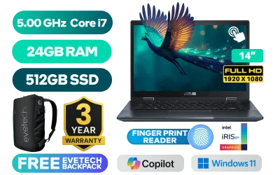 [TOUCHSCREEN] ASUS Expertbook B3 Flip B3402FVA 13th Gen Intel® Core™ i7-1355U up to 5.00GHz Processor, 12MB Cache, 10x Cores, 12x Threads / 24GB DDR4 RAM / 512GB Ultra-Fast NVMe SSD / 14" FHD 1920 x 1080 Wide view Glossy Display With Touch Screen / Integrated Intel® Iris® Xe Graphics / Windows 11 Home (64bit) / Intel AV Stream Camera + HD UVC Webcam / Intel® Wi-Fi 6 AX201 Wireless LAN / Bluetooth 5.3 / 2x USB-A / 2x USB Type-C / 1x HDMI / 1 x Headphone & Microphone Audio Combo Jack / 1x RJ45 / Volume Up & Down Button / Pen Bay / Standard Keyboard With Copilot Key / Fingerprint Reader / Free Asus Stylus Included(On the Laptop Body) / ASUS Expertbook B3 Flip B3402FVA Core i7 Laptop Deal[TOUCHSCREEN] ASUS Expertbook B3 Flip B3402FVA 13th Gen Intel® Core™ i7-1355U up to 5.00GHz Processor, 12MB Cache, 10x Cores, 12x Threads / 24GB DDR4 RAM / 512GB Ultra-Fast NVMe SSD / 14" FHD 1920 x 1080 Wide view Glossy Display With Touch Screen / Integrated Intel® Iris® Xe Graphics / Windows 11 Home (64bit) / Intel AV Stream Camera + HD UVC Webcam / Intel® Wi-Fi 6 AX201 Wireless LAN / Bluetooth 5.3 / 2x USB-A / 2x USB Type-C / 1x HDMI / 1 x Headphone & Microphone Audio Combo Jack / 1x RJ45 / Volume Up & Down Button / Pen Bay / Standard Keyboard With Copilot Key / Fingerprint Reader / Free Asus Stylus Included(On the Laptop Body) / ASUS Expertbook B3 Flip B3402FVA Core i7 Laptop Deal [B3402FVA-I716512B0W-3YRS/24GB] / [+] GET FREE EVETECH NEO Premium Gaming Backpack / 3 YEARS WARRANTY / [+] GET FREE Logitech M185 Wireless Mouse+ FREE DELIVERY !