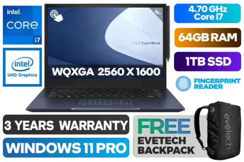 [TOUCHSCREEN][5G] Asus ExpertBook B7 Flip B7402FBA 12th Gen Intel Alder Lake Core i7-1260P up to 4.70GHz Processor, 18MB Cache, 12x Cores, 16x Threads / 64GB DDR5 RAM / 1TB Ultra-Fast NVMe SSD / 14" WQXGA 2560 x 1600 Glossy Touchscreen Display / Integrated Intel® UHD Graphics / <span style="font-size: 20px; color: #00BFFF; font-weight: bold;">Windows 11 Professional (64bit)</span> / Intel® Wi-Fi 6E Wireless LAN / Bluetooth 5.3 / 720p HD camera / 2x USB-A 3.2 / 2 x USB 3.2 Type-C Thunderbolt 4 / 1x HDMI 2.0b / 1x Mini Display Port / 1 x Headphone & Microphone Audio Combo Jack / 1x Micro HDMI (RJ45 lan) / 1x Smart Card Reader / 1x SIM Card Slot / White Backlit Chiclet Keyboard / Fingerprint Reader / Free Stylus Pen / Free Micro HDMI to RJ45 Adapter / Asus ExpertBook B7 Flip B7402FBA Core i7 Laptop Deal[TOUCHSCREEN][5G] Asus ExpertBook B7 Flip B7402FBA 12th Gen Intel Alder Lake Core i7-1260P up to 4.70GHz Processor, 18MB Cache, 12x Cores, 16x Threads / 64GB DDR5 RAM / 1TB Ultra-Fast NVMe SSD / 14" WQXGA 2560 x 1600 Glossy Touchscreen Display / Integrated Intel® UHD Graphics / Windows 11 Professional (64bit) / Intel® Wi-Fi 6E Wireless LAN / Bluetooth 5.3 / 720p HD camera / 2x USB-A 3.2 / 2 x USB 3.2 Type-C Thunderbolt 4 / 1x HDMI 2.0b / 1x Mini Display Port / 1 x Headphone & Microphone Audio Combo Jack / 1x Micro HDMI (RJ45 lan) / 1x Smart Card Reader / 1x SIM Card Slot / White Backlit Chiclet Keyboard / Fingerprint Reader / Free Stylus Pen / Free Micro HDMI to RJ45 Adapter / Asus ExpertBook B7 Flip B7402FBA Core i7 Laptop Deal [B7402FBA-I73210B1X/64GB] / 3 YEARS WARRANTY / [+] GET FREE EVETECH NEO Premium Gaming Backpack+ FREE DELIVERY !
