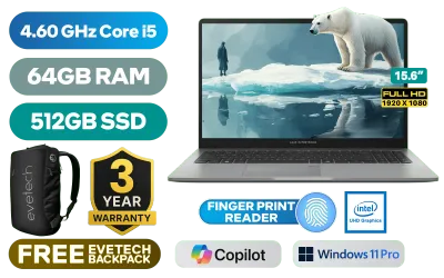 Asus ExpertBook P5 P1503CVA Intel® Core™ i5-13420H up to 4.60GHz Processor, 12MB Cache, 8x Cores, 12x Threads / 64GB DDR5 RAM / 512GB Ultra-Fast NVMe SSD / 15.6" FHD (1920 x 1080) Anti-Glare Display / Integrated Intel UHD Graphics / <span style="font-size: 20px; color: #00BFFF; font-weight: bold;">Windows 11 Professional (64bit)</span> / Realtek RTL8852BE Wifi 6 Wireless LAN / Bluetooth 5.4 / 720p HD Camera with Privacy Shutter / 2x USB Type-A / 2 x USB Type-C (Supports Power Delivery/ DisplayPort) / 1x HDMI / 1 x Headphone & Microphone Combo Jack / 1x RJ45 / Fingerprint Reader / Audio by Dirac / Asus ExpertBook P1 P1503CVA Core i5 Laptop DealAsus ExpertBook P5 P1503CVA Intel® Core™ i5-13420H up to 4.60GHz Processor, 12MB Cache, 8x Cores, 12x Threads / 64GB DDR5 RAM / 512GB Ultra-Fast NVMe SSD / 15.6" FHD (1920 x 1080) Anti-Glare Display / Integrated Intel UHD Graphics / Windows 11 Professional (64bit) / Realtek RTL8852BE Wifi 6 Wireless LAN / Bluetooth 5.4 / 720p HD Camera with Privacy Shutter / 2x USB Type-A / 2 x USB Type-C (Supports Power Delivery/ DisplayPort) / 1x HDMI / 1 x Headphone & Microphone Combo Jack / 1x RJ45 / Fingerprint Reader / Audio by Dirac / Asus ExpertBook P1 P1503CVA Core i5 Laptop Deal [P1503CVA-I58512G1X/64GB] / 3 YEARS WARRANTY / [+] GET FREE EVETECH NEO Premium Gaming Backpack+ FREE DELIVERY !