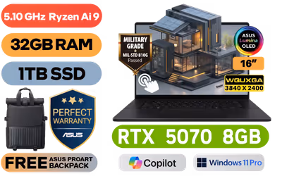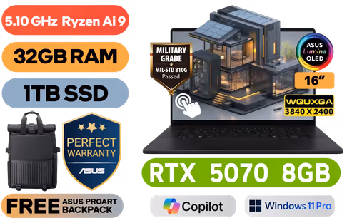 [TOUCHSCREEN] ASUS ProArt P16 Studiobook AMD Ryzen™ AI 9 HX 370 up to 5.10GHz Processor, 36MB Cache, 12x Cores, 24x Threads / 32GB LPDDR5X RAM / 1TB Ultra-Fast NVMe SSD / 16" 4K (3840 x 2400) OLED Touchscreen Display / NVIDIA 50 Series GeForce RTX 5070 8GB GDDR7 Dedicated Graphics / <span style="font-size: 18px; color: blue;">Windows 11 Professional (64bit)</span> / FHD Camera With IR Function To Support Windows Hello / Bluetooth 5.4 / Mediatek Wi-Fi 7 MT7925 Wireless LAN / 2x USB Type-A / 2x USB Type C (with Power Delivery and Support Display) / 1x HDMI 2.1 FRL / 1x Microphone and Headphone Combo jack / 1x SD Card Reader / White Backlit Keyboard / Built-in speaker with Smart Amp Technology / ASUS ProArt P16 Studiobook RYZEN AI 9 RTX 5070 Touchscreen Laptop Deal[TOUCHSCREEN] ASUS ProArt P16 Studiobook AMD Ryzen™ AI 9 HX 370 up to 5.10GHz Processor, 36MB Cache, 12x Cores, 24x Threads / 32GB LPDDR5X RAM / 1TB Ultra-Fast NVMe SSD / 16" 4K (3840 x 2400) OLED Touchscreen Display / NVIDIA 50 Series GeForce RTX 5070 8GB GDDR7 Dedicated Graphics / Windows 11 Professional (64bit) / FHD Camera With IR Function To Support Windows Hello / Bluetooth 5.4 / Mediatek Wi-Fi 7 MT7925 Wireless LAN / 2x USB Type-A / 2x USB Type C (with Power Delivery and Support Display) / 1x HDMI 2.1 FRL / 1x Microphone and Headphone Combo jack / 1x SD Card Reader / White Backlit Keyboard / Built-in speaker with Smart Amp Technology / ASUS ProArt P16 Studiobook RYZEN AI 9 RTX 5070 Touchscreen Laptop Deal [H7606WP-O93210B0X] / 3 YEARS WARRANTY / [+] Get PRAGMATA with select GeForce RTX 50 Series + FREE DELIVERY !
