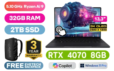 ASUS ProArt PX13 OLED AMD Ryzen AI 9 HX 370 up to 5.10GHz Processor, 36MB Cache, 12x Cores, 24x Threads / 32GB LPDDR5X RAM / 2TB Ultra-Fast NVMe SSD / 13.3" 3K OLED 2880 x 1800 TouchScreen Display / NVIDIA 40 Series GeForce RTX 4070 8GB GDDR6 Dedicated Graphics / <span style="font-size: 20px; color: #00BFFF; font-weight: bold;">Windows 11 Professional (64bit)</span> / FHD camera with IR function to support Windows Hello / White Backlit Keyboard / Bluetooth 5.4 / Wi-Fi 7 Wireless LAN / 1x USB Gen 2 Type-A / 2x Type C USB 4.0 Gen 3 with Power Delivery and Support Display / 1x HDMI / 1x Microphone and Headphone Combo jack / 1x Micro SD Card Reader / Harman/Kardon Premium Audio / 2 Years Warranty / +Free Stylus Pen / ASUS ProArt PX13 OLED Ryzen AI 9 RTX 4070 Professional Laptop DealASUS ProArt PX13 OLED AMD Ryzen AI 9 HX 370 up to 5.10GHz Processor, 36MB Cache, 12x Cores, 24x Threads / 32GB LPDDR5X RAM / 2TB Ultra-Fast NVMe SSD / 13.3" 3K OLED 2880 x 1800 TouchScreen Display / NVIDIA 40 Series GeForce RTX 4070 8GB GDDR6 Dedicated Graphics / Windows 11 Professional (64bit) / FHD camera with IR function to support Windows Hello / White Backlit Keyboard / Bluetooth 5.4 / Wi-Fi 7 Wireless LAN / 1x USB Gen 2 Type-A / 2x Type C USB 4.0 Gen 3 with Power Delivery and Support Display / 1x HDMI / 1x Microphone and Headphone Combo jack / 1x Micro SD Card Reader / Harman/Kardon Premium Audio / 2 Years Warranty / +Free Stylus Pen / ASUS ProArt PX13 OLED Ryzen AI 9 RTX 4070 Professional Laptop Deal [HN7306WI-O93210B0X-3YRS/2TB] / [+] GET FREE EVETECH NEO Premium Gaming Backpack / 3 YEARS WARRANTY + FREE DELIVERY !