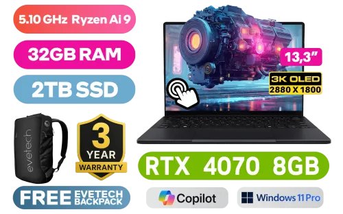ASUS ProArt PX13 OLED AMD Ryzen AI 9 HX 370 up to 5.10GHz Processor, 36MB Cache, 12x Cores, 24x Threads / 32GB LPDDR5X RAM / 2TB Ultra-Fast NVMe SSD / 13.3" 3K OLED 2880 x 1800 TouchScreen Display / NVIDIA 40 Series GeForce RTX 4070 8GB GDDR6 Dedicated Graphics / <span style="font-size: 20px; color: #00BFFF; font-weight: bold;">Windows 11 Professional (64bit)</span> / FHD camera with IR function to support Windows Hello / White Backlit Keyboard / Bluetooth 5.4 / Wi-Fi 7 Wireless LAN / 1x USB Gen 2 Type-A / 2x Type C USB 4.0 Gen 3 with Power Delivery and Support Display / 1x HDMI / 1x Microphone and Headphone Combo jack / 1x Micro SD Card Reader / Harman/Kardon Premium Audio / 2 Years Warranty / +Free Stylus Pen / ASUS ProArt PX13 OLED Ryzen AI 9 RTX 4070 Professional Laptop DealASUS ProArt PX13 OLED AMD Ryzen AI 9 HX 370 up to 5.10GHz Processor, 36MB Cache, 12x Cores, 24x Threads / 32GB LPDDR5X RAM / 2TB Ultra-Fast NVMe SSD / 13.3" 3K OLED 2880 x 1800 TouchScreen Display / NVIDIA 40 Series GeForce RTX 4070 8GB GDDR6 Dedicated Graphics / Windows 11 Professional (64bit) / FHD camera with IR function to support Windows Hello / White Backlit Keyboard / Bluetooth 5.4 / Wi-Fi 7 Wireless LAN / 1x USB Gen 2 Type-A / 2x Type C USB 4.0 Gen 3 with Power Delivery and Support Display / 1x HDMI / 1x Microphone and Headphone Combo jack / 1x Micro SD Card Reader / Harman/Kardon Premium Audio / 2 Years Warranty / +Free Stylus Pen / ASUS ProArt PX13 OLED Ryzen AI 9 RTX 4070 Professional Laptop Deal [HN7306WI-O93210B0X-3YRS/2TB] / [+] GET FREE EVETECH NEO Premium Gaming Backpack / 3 YEARS WARRANTY + FREE DELIVERY !