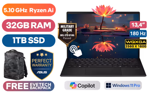 Asus ROG Flow Z13 GZ302EA AMD Ryzen™ AI MAX+ 395 up to 5.10GHz Processor, 80MB Cache, 16x Cores, 21x Threads / 32GB LPDDR5X RAM / 1TB Ultra-Fast NVMe SSD / 13.4" WQXGA (2560 x 1600) 180Hz Touch Screen Display / AMD Radeon Integrated Graphics / <span style="font-size: 20px; color: #00BFFF; font-weight: bold;">Windows 11 Professional (64bit)</span> / 13MP Camera and 5MP IR Camera / Wi-Fi 7 Wireless LAN / Bluetooth 5.4 / 1 x USB Type-A / 2 x USB Type-C / 1 x HDMI / 1 x Headphone and Microphone Audio Combo Jack / 1 x MicroSD Card Reader / Backlit Chiclet Keyboard 1-Zone RGB / 2x 2W dual-force with Smart Amp Technology / Asus Sleeve / Asus Pen / Asus ROG Flow Z13 GZ302 Ryzen™ AI MAX+ LaptopAsus ROG Flow Z13 GZ302EA AMD Ryzen™ AI MAX+ 395 up to 5.10GHz Processor, 80MB Cache, 16x Cores, 21x Threads / 32GB LPDDR5X RAM / 1TB Ultra-Fast NVMe SSD / 13.4" WQXGA (2560 x 1600) 180Hz Touch Screen Display / AMD Radeon Integrated Graphics / Windows 11 Professional (64bit) / 13MP Camera and 5MP IR Camera / Wi-Fi 7 Wireless LAN / Bluetooth 5.4 / 1 x USB Type-A / 2 x USB Type-C / 1 x HDMI / 1 x Headphone and Microphone Audio Combo Jack / 1 x MicroSD Card Reader / Backlit Chiclet Keyboard 1-Zone RGB / 2x 2W dual-force with Smart Amp Technology / Asus Sleeve / Asus Pen / Asus ROG Flow Z13 GZ302 Ryzen™ AI MAX+ Laptop [GZ302EA-RU043X] / 3 YEARS WARRANTY / [+] GET FREE EVETECH DASH Premium Gaming Backpack+ FREE DELIVERY !