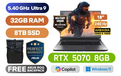 [G-SYNC] ASUS ROG STRIX 18 G815LP Intel® Core™ Ultra 9-275HX up to 5.40GHz Processor, 36MB Cache, 24x Cores, 24x Threads / 32GB DDR5 RAM / 8TB Ultra-Fast PCIe NVMe SSD / 18" WQXGA (2560 x 1600) 240Hz Anti-Glare IPS-Level Display / NVIDIA 50 Series GeForce RTX 5070 8GB GDDR7 Graphics Card / Windows 11 Home (64bit) / 1080P FHD IR Camera / Tri-Band Wi-Fi 7 Wireless LAN / Dual Bluetooth 5.4 / 3x USB Type-A / 2x USB Type-C (Thunderbolt™ 4 with support for DisplayPort™ / power delivery / G-SYNC) / 1 x HDMI / 1 x Headphone & Microphone Audio Combo Jack / 1x RJ45 / Per-key RGB Backlit Chicklet Keyboard / 2 speakers with Dolby Atmos / FREE ASUS ROG Backpack / ASUS ROG STRIX 18 G815LP Ultra 9 RTX 5070 Gaming Laptop Deal[G-SYNC] ASUS ROG STRIX 18 G815LP Intel® Core™ Ultra 9-275HX up to 5.40GHz Processor, 36MB Cache, 24x Cores, 24x Threads / 32GB DDR5 RAM / 8TB Ultra-Fast PCIe NVMe SSD / 18" WQXGA (2560 x 1600) 240Hz Anti-Glare IPS-Level Display / NVIDIA 50 Series GeForce RTX 5070 8GB GDDR7 Graphics Card / Windows 11 Home (64bit) / 1080P FHD IR Camera / Tri-Band Wi-Fi 7 Wireless LAN / Dual Bluetooth 5.4 / 3x USB Type-A / 2x USB Type-C (Thunderbolt™ 4 with support for DisplayPort™ / power delivery / G-SYNC) / 1 x HDMI / 1 x Headphone & Microphone Audio Combo Jack / 1x RJ45 / Per-key RGB Backlit Chicklet Keyboard / 2 speakers with Dolby Atmos / FREE ASUS ROG Backpack / ASUS ROG STRIX 18 G815LP Ultra 9 RTX 5070 Gaming Laptop Deal [G815LP-U91610G0W/32GB/8TB] / 3 YEARS WARRANTY / [+]Get Resident Evil: Requiem with select GeForce RTX 50 Series (Standard Edition)+ FREE DELIVERY !