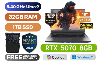 [G-SYNC] ASUS ROG STRIX 18 G815LP Intel® Core™ Ultra 9-275HX up to 5.40GHz Processor, 36MB Cache, 24x Cores, 24x Threads / 32GB DDR5 RAM / 1TB Ultra-Fast PCIe NVMe SSD / 18" WQXGA (2560 x 1600) 240Hz Anti-Glare IPS-Level Display / NVIDIA 50 Series GeForce RTX 5070 8GB GDDR7 Graphics Card / Windows 11 Home (64bit) / 1080P FHD IR Camera / Tri-Band Wi-Fi 7 Wireless LAN / Dual Bluetooth 5.4 / 3x USB Type-A / 2x USB Type-C (Thunderbolt™ 4 with support for DisplayPort™ / power delivery / G-SYNC) / 1 x HDMI / 1 x Headphone & Microphone Audio Combo Jack / 1x RJ45 / Per-key RGB Backlit Chicklet Keyboard / 2 speakers with Dolby Atmos / FREE ASUS ROG Backpack / ASUS ROG STRIX 18 G815LP Ultra 9 RTX 5070 Gaming Laptop Deal[G-SYNC] ASUS ROG STRIX 18 G815LP Intel® Core™ Ultra 9-275HX up to 5.40GHz Processor, 36MB Cache, 24x Cores, 24x Threads / 32GB DDR5 RAM / 1TB Ultra-Fast PCIe NVMe SSD / 18" WQXGA (2560 x 1600) 240Hz Anti-Glare IPS-Level Display / NVIDIA 50 Series GeForce RTX 5070 8GB GDDR7 Graphics Card / Windows 11 Home (64bit) / 1080P FHD IR Camera / Tri-Band Wi-Fi 7 Wireless LAN / Dual Bluetooth 5.4 / 3x USB Type-A / 2x USB Type-C (Thunderbolt™ 4 with support for DisplayPort™ / power delivery / G-SYNC) / 1 x HDMI / 1 x Headphone & Microphone Audio Combo Jack / 1x RJ45 / Per-key RGB Backlit Chicklet Keyboard / 2 speakers with Dolby Atmos / FREE ASUS ROG Backpack / ASUS ROG STRIX 18 G815LP Ultra 9 RTX 5070 Gaming Laptop Deal [G815LP-U91610G0W/32GB] / 3 YEARS WARRANTY / [+]Get Resident Evil: Requiem with select GeForce RTX 50 Series (Standard Edition)+ FREE DELIVERY !