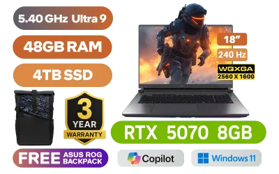 [G-SYNC] ASUS ROG STRIX 18 G815LP Intel® Core™ Ultra 9-275HX up to 5.40GHz Processor, 36MB Cache, 24x Cores, 24x Threads / 48GB DDR5 RAM / 4TB Ultra-Fast PCIe NVMe SSD / 18" WQXGA (2560 x 1600) 240Hz Anti-Glare IPS-Level Display / NVIDIA 50 Series GeForce RTX 5070 8GB GDDR7 Graphics Card / Windows 11 Home (64bit) / 1080P FHD IR Camera / Tri-Band Wi-Fi 7 Wireless LAN / Dual Bluetooth 5.4 / 3x USB Type-A / 2x USB Type-C (Thunderbolt™ 4 with support for DisplayPort™ / power delivery / G-SYNC) / 1 x HDMI / 1 x Headphone & Microphone Audio Combo Jack / 1x RJ45 / Per-key RGB Backlit Chicklet Keyboard / 2 speakers with Dolby Atmos / FREE ASUS ROG Backpack / ASUS ROG STRIX 18 G815LP Ultra 9 RTX 5070 Gaming Laptop Deal[G-SYNC] ASUS ROG STRIX 18 G815LP Intel® Core™ Ultra 9-275HX up to 5.40GHz Processor, 36MB Cache, 24x Cores, 24x Threads / 48GB DDR5 RAM / 4TB Ultra-Fast PCIe NVMe SSD / 18" WQXGA (2560 x 1600) 240Hz Anti-Glare IPS-Level Display / NVIDIA 50 Series GeForce RTX 5070 8GB GDDR7 Graphics Card / Windows 11 Home (64bit) / 1080P FHD IR Camera / Tri-Band Wi-Fi 7 Wireless LAN / Dual Bluetooth 5.4 / 3x USB Type-A / 2x USB Type-C (Thunderbolt™ 4 with support for DisplayPort™ / power delivery / G-SYNC) / 1 x HDMI / 1 x Headphone & Microphone Audio Combo Jack / 1x RJ45 / Per-key RGB Backlit Chicklet Keyboard / 2 speakers with Dolby Atmos / FREE ASUS ROG Backpack / ASUS ROG STRIX 18 G815LP Ultra 9 RTX 5070 Gaming Laptop Deal [G815LP-U91610G0W/48GB/4TB] / 3 YEARS WARRANTY / [+]Get Resident Evil Requiem with select GeForce RTX 50 Series (Standard Edition)+ FREE DELIVERY !