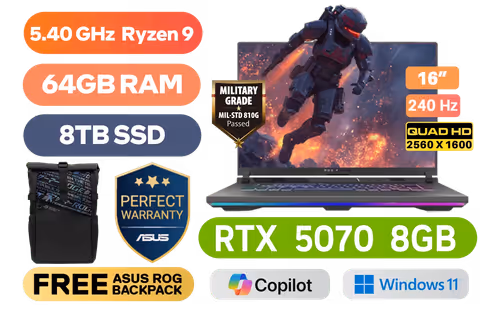 [G-SYNC] ASUS ROG Strix G16 AMD Ryzen 9-9955HX up to 5.40GHz Processor, 80MB Cache, 16x Cores, 32x Threads / 64GB DDR5 RAM / 8TB Ultra-Fast NVMe SSD / 16" 2.5K (2560 x 1600) 240Hz ROG Nebula Display / NVIDIA 50 Series GeForce RTX 5070 8GB GDDR7 Graphics Card / Windows 11 Home (64bit) / 1080P FHD Camera / Mediatek Wi-Fi 6E MT7922 Wireless LAN / Bluetooth 5.3 / 2 x USB Type-A / 2x USB Type-C with support for DisplayPort™ (data speed up to 40Gbps) / 1 x HDMI / 1 x Headphone and Microphone Audio Combo Jack / 1x RJ-45 / RGB Backlit Keyboard / Dolby Atmos Audio / FREE ASUS ROG Backpack / ASUS ROG Strix G16 AMD Ryzen 9 RTX 5070 Gaming Laptop Deal[G-SYNC] ASUS ROG Strix G16 AMD Ryzen 9-9955HX up to 5.40GHz Processor, 80MB Cache, 16x Cores, 32x Threads / 64GB DDR5 RAM / 8TB Ultra-Fast NVMe SSD / 16" 2.5K (2560 x 1600) 240Hz ROG Nebula Display / NVIDIA 50 Series GeForce RTX 5070 8GB GDDR7 Graphics Card / Windows 11 Home (64bit) / 1080P FHD Camera / Mediatek Wi-Fi 6E MT7922 Wireless LAN / Bluetooth 5.3 / 2 x USB Type-A / 2x USB Type-C with support for DisplayPort™ (data speed up to 40Gbps) / 1 x HDMI / 1 x Headphone and Microphone Audio Combo Jack / 1x RJ-45 / RGB Backlit Keyboard / Dolby Atmos Audio / FREE ASUS ROG Backpack / ASUS ROG Strix G16 AMD Ryzen 9 RTX 5070 Gaming Laptop Deal [G614FP-91610G0W/64GB/8TB] / 3 YEARS WARRANTY / [+] Get PRAGMATA with select GeForce RTX 50 Series + FREE DELIVERY !