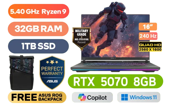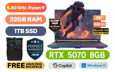 [G-SYNC] ASUS ROG Strix G16 AMD Ryzen 9-9955HX up to 5.40GHz Processor, 80MB Cache, 16x Cores, 32x Threads / 32GB DDR5 RAM / 1TB Ultra-Fast NVMe SSD / 16" 2.5K (2560 x 1600) 240Hz ROG Nebula Display / NVIDIA 50 Series GeForce RTX 5070 8GB GDDR7 Graphics Card / Windows 11 Home (64bit) / 1080P FHD Camera / Mediatek Wi-Fi 6E MT7922 Wireless LAN / Bluetooth 5.3 / 2 x USB Type-A / 2x USB Type-C with support for DisplayPort™ (data speed up to 40Gbps) / 1 x HDMI / 1 x Headphone and Microphone Audio Combo Jack / 1x RJ-45 / RGB Backlit Keyboard / Dolby Atmos Audio / FREE ASUS ROG Backpack / ASUS ROG Strix G16 AMD Ryzen 9 RTX 5070 Gaming Laptop Deal[G-SYNC] ASUS ROG Strix G16 AMD Ryzen 9-9955HX up to 5.40GHz Processor, 80MB Cache, 16x Cores, 32x Threads / 32GB DDR5 RAM / 1TB Ultra-Fast NVMe SSD / 16" 2.5K (2560 x 1600) 240Hz ROG Nebula Display / NVIDIA 50 Series GeForce RTX 5070 8GB GDDR7 Graphics Card / Windows 11 Home (64bit) / 1080P FHD Camera / Mediatek Wi-Fi 6E MT7922 Wireless LAN / Bluetooth 5.3 / 2 x USB Type-A / 2x USB Type-C with support for DisplayPort™ (data speed up to 40Gbps) / 1 x HDMI / 1 x Headphone and Microphone Audio Combo Jack / 1x RJ-45 / RGB Backlit Keyboard / Dolby Atmos Audio / FREE ASUS ROG Backpack / ASUS ROG Strix G16 AMD Ryzen 9 RTX 5070 Gaming Laptop Deal [G614FP-91610G0W/32GB] / 3 YEARS WARRANTY / [+] Get Crimson Desert with select AMD Mobile products / [+]Get Resident Evil: Requiem with select GeForce RTX 50 Series (Standard Edition)+ FREE DELIVERY !