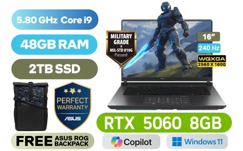 ASUS ROG Strix G16 Intel Core i9 14900HX up to 5.80GHz Processor, 36MB Cache, 24x Cores, 32x Threads / 48GB DDR5 RAM / 2TB Ultra-Fast NVMe SSD / 16" WQXGA (2560 x 1600) 240Hz Refresh Rate Anti-Glare IPS-Level ROG Nebula Display / NVIDIA 50 Series GeForce RTX 5060 8GB GDDR7 Graphics Card / Windows 11 Home (64bit) / 1080P FHD IR Camera / Intel Wi-Fi 7 BE200 Wireless LAN / Bluetooth 5.4 / 3 x USB Type-A / 2x USB Type-C / 1 x HDMI / 1 x Headphone and Microphone Audio Combo Jack / 1x RJ-45 / Per-Key RGB Backlit Keyboard / Dolby Atmos Audio with Smart Amp Technology / FREE ASUS ROG Backpack / ASUS ROG Strix G16 G615JMR Core i9 RTX 5060 Gaming Laptop DealASUS ROG Strix G16 Intel Core i9 14900HX up to 5.80GHz Processor, 36MB Cache, 24x Cores, 32x Threads / 48GB DDR5 RAM / 2TB Ultra-Fast NVMe SSD / 16" WQXGA (2560 x 1600) 240Hz Refresh Rate Anti-Glare IPS-Level ROG Nebula Display / NVIDIA 50 Series GeForce RTX 5060 8GB GDDR7 Graphics Card / Windows 11 Home (64bit) / 1080P FHD IR Camera / Intel Wi-Fi 7 BE200 Wireless LAN / Bluetooth 5.4 / 3 x USB Type-A / 2x USB Type-C / 1 x HDMI / 1 x Headphone and Microphone Audio Combo Jack / 1x RJ-45 / Per-Key RGB Backlit Keyboard / Dolby Atmos Audio with Smart Amp Technology / FREE ASUS ROG Backpack / ASUS ROG Strix G16 G615JMR Core i9 RTX 5060 Gaming Laptop Deal [G615JMR-I91610G0W/48GB/2TB] / 3 YEARS WARRANTY + FREE DELIVERY !