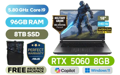 ASUS ROG Strix G16 Intel Core i9 14900HX up to 5.80GHz Processor, 36MB Cache, 24x Cores, 32x Threads / 96GB DDR5 RAM / 8TB Ultra-Fast NVMe SSD / 16" WQXGA (2560 x 1600) 240Hz Refresh Rate Anti-Glare IPS-Level ROG Nebula Display / NVIDIA 50 Series GeForce RTX 5060 8GB GDDR7 Graphics Card / Windows 11 Home (64bit) / 1080P FHD IR Camera / Intel Wi-Fi 7 BE200 Wireless LAN / Bluetooth 5.4 / 3 x USB Type-A / 2x USB Type-C / 1 x HDMI / 1 x Headphone and Microphone Audio Combo Jack / 1x RJ-45 / Per-Key RGB Backlit Keyboard / Dolby Atmos Audio with Smart Amp Technology / FREE ASUS ROG Backpack / ASUS ROG Strix G16 G615JMR Core i9 RTX 5060 Gaming Laptop DealASUS ROG Strix G16 Intel Core i9 14900HX up to 5.80GHz Processor, 36MB Cache, 24x Cores, 32x Threads / 96GB DDR5 RAM / 8TB Ultra-Fast NVMe SSD / 16" WQXGA (2560 x 1600) 240Hz Refresh Rate Anti-Glare IPS-Level ROG Nebula Display / NVIDIA 50 Series GeForce RTX 5060 8GB GDDR7 Graphics Card / Windows 11 Home (64bit) / 1080P FHD IR Camera / Intel Wi-Fi 7 BE200 Wireless LAN / Bluetooth 5.4 / 3 x USB Type-A / 2x USB Type-C / 1 x HDMI / 1 x Headphone and Microphone Audio Combo Jack / 1x RJ-45 / Per-Key RGB Backlit Keyboard / Dolby Atmos Audio with Smart Amp Technology / FREE ASUS ROG Backpack / ASUS ROG Strix G16 G615JMR Core i9 RTX 5060 Gaming Laptop Deal [G615JMR-I91610G0W/96GB/8TB] / 3 YEARS WARRANTY + FREE DELIVERY !
