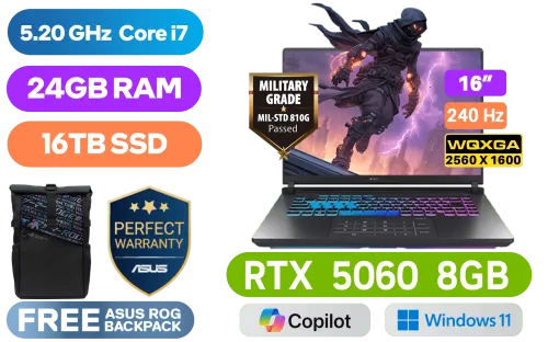 [G-SYNC] ASUS ROG Strix G16 Intel Core i7-14650HX up to 5.20GHz Processor, 30MB Cache, 16x Cores, 24x Threads / 24GB DDR5 RAM / 16TB Ultra-Fast NVMe SSD / 16" WQXGA (2560 x 1600) 240Hz Anti-Glare IPS Display / NVIDIA 50 Series GeForce RTX 5060 8GB GDDR7 Graphics Card / 1080P FHD IR Camera / Windows 11 Home (64bit) / Intel Wi-Fi 7 BE200 Wireless LAN / Bluetooth 5.4 / 3 x USB Type-A / 2x USB Type-C (Thunderbolt™ 4, DisplayPort™ / power delivery) / 1 x HDMI / 1 x Headphone and Microphone Audio Combo Jack / 1x RJ-45 / RGB Backlit Keyboard / Dolby Atmos Audio with Smart Amp Technology / FREE ASUS ROG Backpack / ASUS ROG Strix G16 G615JMR Core i7 RTX 5060 Gaming Laptop Deal[G-SYNC] ASUS ROG Strix G16 Intel Core i7-14650HX up to 5.20GHz Processor, 30MB Cache, 16x Cores, 24x Threads / 24GB DDR5 RAM / 16TB Ultra-Fast NVMe SSD / 16" WQXGA (2560 x 1600) 240Hz Anti-Glare IPS Display / NVIDIA 50 Series GeForce RTX 5060 8GB GDDR7 Graphics Card / 1080P FHD IR Camera / Windows 11 Home (64bit) / Intel Wi-Fi 7 BE200 Wireless LAN / Bluetooth 5.4 / 3 x USB Type-A / 2x USB Type-C (Thunderbolt™ 4, DisplayPort™ / power delivery) / 1 x HDMI / 1 x Headphone and Microphone Audio Combo Jack / 1x RJ-45 / RGB Backlit Keyboard / Dolby Atmos Audio with Smart Amp Technology / FREE ASUS ROG Backpack / ASUS ROG Strix G16 G615JMR Core i7 RTX 5060 Gaming Laptop Deal [G615JMR-I71610G0W/24GB/16TB] / 3 YEARS WARRANTY + FREE DELIVERY !