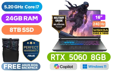 [G-SYNC] ASUS ROG Strix G16 Intel Core i7-14650HX up to 5.20GHz Processor, 30MB Cache, 16x Cores, 24x Threads / 24GB DDR5 RAM / 8TB Ultra-Fast NVMe SSD / 16" WQXGA (2560 x 1600) 240Hz Anti-Glare IPS Display / NVIDIA 50 Series GeForce RTX 5060 8GB GDDR7 Graphics Card / 1080P FHD IR Camera / Windows 11 Home (64bit) / Intel Wi-Fi 7 BE200 Wireless LAN / Bluetooth 5.4 / 3 x USB Type-A / 2x USB Type-C (Thunderbolt™ 4, DisplayPort™ / power delivery) / 1 x HDMI / 1 x Headphone and Microphone Audio Combo Jack / 1x RJ-45 / RGB Backlit Keyboard / Dolby Atmos Audio with Smart Amp Technology / FREE ASUS ROG Backpack / ASUS ROG Strix G16 G615JMR Core i7 RTX 5060 Gaming Laptop Deal[G-SYNC] ASUS ROG Strix G16 Intel Core i7-14650HX up to 5.20GHz Processor, 30MB Cache, 16x Cores, 24x Threads / 24GB DDR5 RAM / 8TB Ultra-Fast NVMe SSD / 16" WQXGA (2560 x 1600) 240Hz Anti-Glare IPS Display / NVIDIA 50 Series GeForce RTX 5060 8GB GDDR7 Graphics Card / 1080P FHD IR Camera / Windows 11 Home (64bit) / Intel Wi-Fi 7 BE200 Wireless LAN / Bluetooth 5.4 / 3 x USB Type-A / 2x USB Type-C (Thunderbolt™ 4, DisplayPort™ / power delivery) / 1 x HDMI / 1 x Headphone and Microphone Audio Combo Jack / 1x RJ-45 / RGB Backlit Keyboard / Dolby Atmos Audio with Smart Amp Technology / FREE ASUS ROG Backpack / ASUS ROG Strix G16 G615JMR Core i7 RTX 5060 Gaming Laptop Deal [G615JMR-I71610G0W/24GB/8TB] / 3 YEARS WARRANTY + FREE DELIVERY !