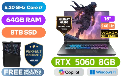 [G-SYNC] ASUS ROG Strix G16 Intel Core i7-14650HX up to 5.20GHz Processor, 30MB Cache, 16x Cores, 24x Threads / 64GB DDR5 RAM / 8TB Ultra-Fast NVMe SSD / 16" WQXGA (2560 x 1600) 240Hz Anti-Glare IPS Display / NVIDIA 50 Series GeForce RTX 5060 8GB GDDR7 Graphics Card / 1080P FHD IR Camera / Windows 11 Home (64bit) / Intel Wi-Fi 7 BE200 Wireless LAN / Bluetooth 5.4 / 3 x USB Type-A / 2x USB Type-C (Thunderbolt™ 4, DisplayPort™ / power delivery) / 1 x HDMI / 1 x Headphone and Microphone Audio Combo Jack / 1x RJ-45 / RGB Backlit Keyboard / Dolby Atmos Audio with Smart Amp Technology / FREE ASUS ROG Backpack / ASUS ROG Strix G16 G615JMR Core i7 RTX 5060 Gaming Laptop Deal[G-SYNC] ASUS ROG Strix G16 Intel Core i7-14650HX up to 5.20GHz Processor, 30MB Cache, 16x Cores, 24x Threads / 64GB DDR5 RAM / 8TB Ultra-Fast NVMe SSD / 16" WQXGA (2560 x 1600) 240Hz Anti-Glare IPS Display / NVIDIA 50 Series GeForce RTX 5060 8GB GDDR7 Graphics Card / 1080P FHD IR Camera / Windows 11 Home (64bit) / Intel Wi-Fi 7 BE200 Wireless LAN / Bluetooth 5.4 / 3 x USB Type-A / 2x USB Type-C (Thunderbolt™ 4, DisplayPort™ / power delivery) / 1 x HDMI / 1 x Headphone and Microphone Audio Combo Jack / 1x RJ-45 / RGB Backlit Keyboard / Dolby Atmos Audio with Smart Amp Technology / FREE ASUS ROG Backpack / ASUS ROG Strix G16 G615JMR Core i7 RTX 5060 Gaming Laptop Deal [G615JMR-I71610G0W/64GB/8TB] / 3 YEARS WARRANTY + FREE DELIVERY !