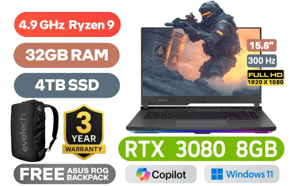 Dolby Atmos Audio / ASUS ROG Strix G15 G513RS Ryzen 9 RTX 3080 Gaming Laptop DealASUS ROG Strix G15 G513RS AMD Ryzen 9-6900HX up to 4.9GHz Processor, 20MB Cache, 8x Cores, 16x Threads / 32GB DDR5 RAM / 4TB Ultra-Fast NVMe SSD / 15.6" FHD 1920x1080 Anti-Glare 3ms 300Hz, IPS Level Thin-Bezel Display / NVIDIA 30 Series GeForce RTX 3080 8GB GDDR6 Dedicated Graphics / Windows 11 Home (64bit) / Per-key RGB Backlit Chiclet Keyboard / Bluetooth v5.2 / Wi-Fi 6 Wireless LAN / 1 x Gigabit Lan Port (RJ45) / 3 x USB Type-A / 2x USB Type-C / 1 x HDMI / 1x Microphone and Headphone Combo jack / 2 speaker with
