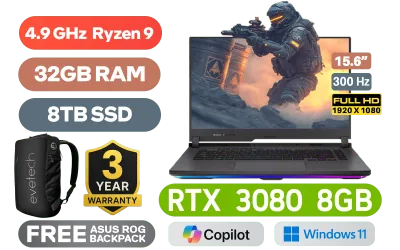 Dolby Atmos Audio / ASUS ROG Strix G15 G513RS Ryzen 9 RTX 3080 Gaming Laptop DealASUS ROG Strix G15 G513RS AMD Ryzen 9-6900HX up to 4.9GHz Processor, 20MB Cache, 8x Cores, 16x Threads / 32GB DDR5 RAM / 8TB Ultra-Fast NVMe SSD / 15.6" FHD 1920x1080 Anti-Glare 3ms 300Hz, IPS Level Thin-Bezel Display / NVIDIA 30 Series GeForce RTX 3080 8GB GDDR6 Dedicated Graphics / Windows 11 Home (64bit) / Per-key RGB Backlit Chiclet Keyboard / Bluetooth v5.2 / Wi-Fi 6 Wireless LAN / 1 x Gigabit Lan Port (RJ45) / 3 x USB Type-A / 2x USB Type-C / 1 x HDMI / 1x Microphone and Headphone Combo jack / 2 speaker with