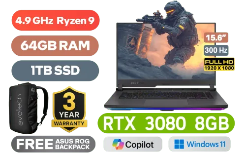 Dolby Atmos Audio / ASUS ROG Strix G15 G513RS Ryzen 9 RTX 3080 Gaming Laptop DealASUS ROG Strix G15 G513RS AMD Ryzen 9-6900HX up to 4.9GHz Processor, 20MB Cache, 8x Cores, 16x Threads / 64GB DDR5 RAM / 1TB Ultra-Fast NVMe SSD / 15.6" FHD 1920x1080 Anti-Glare 3ms 300Hz, IPS Level Thin-Bezel Display / NVIDIA 30 Series GeForce RTX 3080 8GB GDDR6 Dedicated Graphics / Windows 11 Home (64bit) / Per-key RGB Backlit Chiclet Keyboard / Bluetooth v5.2 / Wi-Fi 6 Wireless LAN / 1 x Gigabit Lan Port (RJ45) / 3 x USB Type-A / 2x USB Type-C / 1 x HDMI / 1x Microphone and Headphone Combo jack / 2 speaker with
