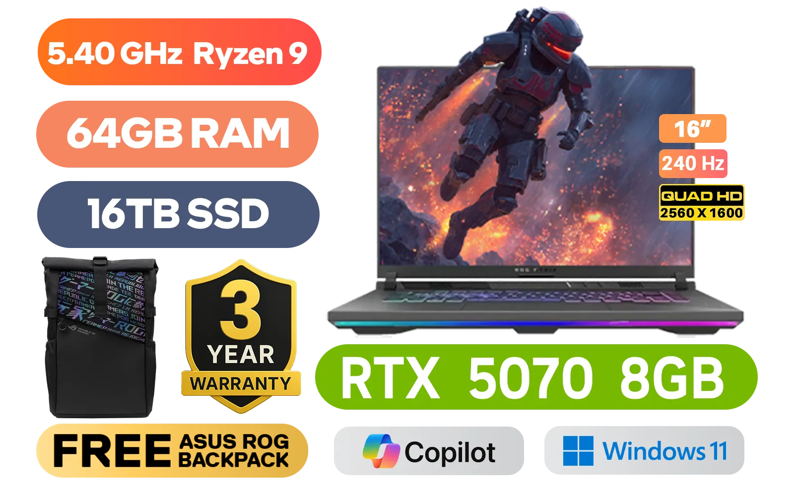 [G-SYNC] ASUS ROG Strix G16 AMD Ryzen 9-9955HX up to 5.40GHz Processor, 80MB Cache, 16x Cores, 32x Threads / 64GB DDR5 RAM / 16TB Ultra-Fast NVMe SSD / 16" 2.5K (2560 x 1600) 240Hz ROG Nebula Display / NVIDIA 50 Series GeForce RTX 5070 8GB GDDR7 Graphics Card / Windows 11 Home (64bit) / 1080P FHD Camera / Mediatek Wi-Fi 6E MT7922 Wireless LAN / Bluetooth 5.3 / 2 x USB Type-A / 2x USB Type-C with support for DisplayPort™ (data speed up to 40Gbps) / 1 x HDMI / 1 x Headphone and Microphone Audio Combo Jack / 1x RJ-45 / RGB Backlit Keyboard / Dolby Atmos Audio / FREE ASUS ROG Backpack / ASUS ROG Strix G16 AMD Ryzen 9 RTX 5070 Gaming Laptop Deal[G-SYNC] ASUS ROG Strix G16 AMD Ryzen 9-9955HX up to 5.40GHz Processor, 80MB Cache, 16x Cores, 32x Threads / 64GB DDR5 RAM / 16TB Ultra-Fast NVMe SSD / 16" 2.5K (2560 x 1600) 240Hz ROG Nebula Display / NVIDIA 50 Series GeForce RTX 5070 8GB GDDR7 Graphics Card / Windows 11 Home (64bit) / 1080P FHD Camera / Mediatek Wi-Fi 6E MT7922 Wireless LAN / Bluetooth 5.3 / 2 x USB Type-A / 2x USB Type-C with support for DisplayPort™ (data speed up to 40Gbps) / 1 x HDMI / 1 x Headphone and Microphone Audio Combo Jack / 1x RJ-45 / RGB Backlit Keyboard / Dolby Atmos Audio / FREE ASUS ROG Backpack / ASUS ROG Strix G16 AMD Ryzen 9 RTX 5070 Gaming Laptop Deal [G614FP-91610G0W/64GB/16TB] / 3 YEARS WARRANTY / [+] Get Crimson Desert with select AMD products / [+]Get Resident Evil Requiem with select GeForce RTX 50 Series (Standard Edition)+ FREE DELIVERY !