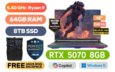 [G-SYNC] ASUS ROG Strix G16 AMD Ryzen 9-9955HX up to 5.40GHz Processor, 80MB Cache, 16x Cores, 32x Threads / 64GB DDR5 RAM / 8TB Ultra-Fast NVMe SSD / 16" 2.5K (2560 x 1600) 240Hz ROG Nebula Display / NVIDIA 50 Series GeForce RTX 5070 8GB GDDR7 Graphics Card / Windows 11 Home (64bit) / 1080P FHD Camera / Mediatek Wi-Fi 6E MT7922 Wireless LAN / Bluetooth 5.3 / 2 x USB Type-A / 2x USB Type-C with support for DisplayPort™ (data speed up to 40Gbps) / 1 x HDMI / 1 x Headphone and Microphone Audio Combo Jack / 1x RJ-45 / RGB Backlit Keyboard / Dolby Atmos Audio / FREE ASUS ROG Backpack / ASUS ROG Strix G16 AMD Ryzen 9 RTX 5070 Gaming Laptop Deal[G-SYNC] ASUS ROG Strix G16 AMD Ryzen 9-9955HX up to 5.40GHz Processor, 80MB Cache, 16x Cores, 32x Threads / 64GB DDR5 RAM / 8TB Ultra-Fast NVMe SSD / 16" 2.5K (2560 x 1600) 240Hz ROG Nebula Display / NVIDIA 50 Series GeForce RTX 5070 8GB GDDR7 Graphics Card / Windows 11 Home (64bit) / 1080P FHD Camera / Mediatek Wi-Fi 6E MT7922 Wireless LAN / Bluetooth 5.3 / 2 x USB Type-A / 2x USB Type-C with support for DisplayPort™ (data speed up to 40Gbps) / 1 x HDMI / 1 x Headphone and Microphone Audio Combo Jack / 1x RJ-45 / RGB Backlit Keyboard / Dolby Atmos Audio / FREE ASUS ROG Backpack / ASUS ROG Strix G16 AMD Ryzen 9 RTX 5070 Gaming Laptop Deal [G614FP-91610G0W/64GB/8TB] / 3 YEARS WARRANTY / [+] Get Crimson Desert with select AMD Mobile products / [+]Get Resident Evil: Requiem with select GeForce RTX 50 Series (Standard Edition)+ FREE DELIVERY !