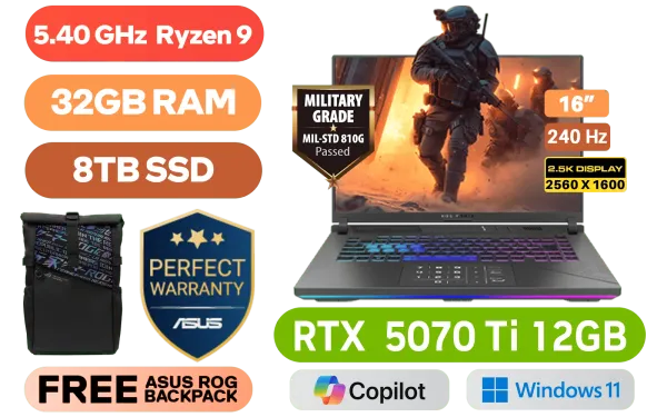 [G-SYNC] ASUS ROG Strix G16 AMD Ryzen 9-9955HX up to 5.40GHz Processor, 80MB Cache, 16x Cores, 32x Threads / 32GB DDR5 RAM / 8TB Ultra-Fast NVMe SSD / 16" 2.5K (2560 x 1600) 240Hz ROG Nebula Display / NVIDIA 50 Series GeForce RTX 5070 Ti 12GB GDDR7 Graphics Card / Windows 11 Home (64bit) / 1080P FHD Camera / Mediatek Wi-Fi 6E MT7922 Wireless LAN / Bluetooth 5.3 / 2 x USB Type-A / 2x USB Gen 2 Type-C / 1 x HDMI 2.1 FRL / 1 x Headphone and Microphone Audio Combo Jack / 1x RJ-45 / Per-Key RGB Backlit Keyboard With Digital Numpad / Dolby Atmos Audio / FREE ASUS ROG Backpack / ASUS ROG Strix G16 AMD Ryzen 9 RTX 5070 Ti Gaming Laptop Deal[G-SYNC] ASUS ROG Strix G16 AMD Ryzen 9-9955HX up to 5.40GHz Processor, 80MB Cache, 16x Cores, 32x Threads / 32GB DDR5 RAM / 8TB Ultra-Fast NVMe SSD / 16" 2.5K (2560 x 1600) 240Hz ROG Nebula Display / NVIDIA 50 Series GeForce RTX 5070 Ti 12GB GDDR7 Graphics Card / Windows 11 Home (64bit) / 1080P FHD Camera / Mediatek Wi-Fi 6E MT7922 Wireless LAN / Bluetooth 5.3 / 2 x USB Type-A / 2x USB Gen 2 Type-C / 1 x HDMI 2.1 FRL / 1 x Headphone and Microphone Audio Combo Jack / 1x RJ-45 / Per-Key RGB Backlit Keyboard With Digital Numpad / Dolby Atmos Audio / FREE ASUS ROG Backpack / ASUS ROG Strix G16 AMD Ryzen 9 RTX 5070 Ti Gaming Laptop Deal [G614FR-91610GR0W/32GB/8TB] / 3 YEARS WARRANTY / [+] Get Crimson Desert with select AMD Mobile products / [+]Get Resident Evil: Requiem with select GeForce RTX 50 Series (Standard Edition)+ FREE DELIVERY !