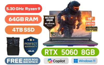[G-SYNC] ASUS ROG Strix G16 AMD Ryzen 9-8940HX up to 5.30GHz Processor, 80MB Cache, 16x Cores, 32x Threads / 64GB DDR5 RAM / 4TB Ultra-Fast NVMe SSD / 16" WQXGA (2560 x 1600) 240Hz IPS-Level Display / NVIDIA 50 Series GeForce RTX 5060 8GB GDDR7 Graphics Card / Windows 11 Home (64bit) / Mediatek Wi-Fi 6E MT7922 Wireless LAN / Bluetooth 5.3 / 1080P FHD Camera / 2 x USB Type-A / 2x USB Type-C (DisplayPort™ / power delivery) / 1 x HDMI / 1 x Headphone and Microphone Combo Jack / 1x RJ-45 / RGB Backlit Chicklet Keyboard / Dolby Atmos Audio / FREE ASUS ROG Backpack / ASUS ROG Strix G16 AMD Ryzen 9 RTX 5060 Gaming Laptop Deal[G-SYNC] ASUS ROG Strix G16 AMD Ryzen 9-8940HX up to 5.30GHz Processor, 80MB Cache, 16x Cores, 32x Threads / 64GB DDR5 RAM / 4TB Ultra-Fast NVMe SSD / 16" WQXGA (2560 x 1600) 240Hz IPS-Level Display / NVIDIA 50 Series GeForce RTX 5060 8GB GDDR7 Graphics Card / Windows 11 Home (64bit) / Mediatek Wi-Fi 6E MT7922 Wireless LAN / Bluetooth 5.3 / 1080P FHD Camera / 2 x USB Type-A / 2x USB Type-C (DisplayPort™ / power delivery) / 1 x HDMI / 1 x Headphone and Microphone Combo Jack / 1x RJ-45 / RGB Backlit Chicklet Keyboard / Dolby Atmos Audio / FREE ASUS ROG Backpack / ASUS ROG Strix G16 AMD Ryzen 9 RTX 5060 Gaming Laptop Deal [G614PM-91610G0W/64GB/4TB] / 3 YEARS WARRANTY / [+] Get Crimson Desert with select AMD Mobile products+ FREE DELIVERY !