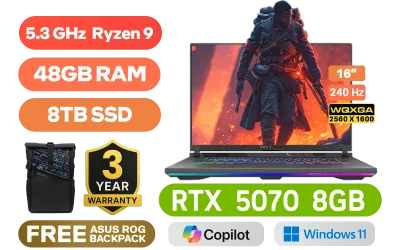 ASUS ROG Strix G16 AMD Ryzen 9 8940HX up to 5.3GHz Processor, 80MB Cache, 16x Cores, 32x Threads / 48GB DDR5 RAM / 8TB Ultra-Fast NVMe SSD / 16" WQXGA (2560 x 1600) 240Hz Anti-Glare IPS-Level Display / NVIDIA 50 Series GeForce RTX 5070 8GB GDDR7 Dedicated Graphics Card / Windows 11 Home (64bit) / MediaTek Wi-Fi 6E MT7922 Wireless LAN / Bluetooth 5.3 / 1080P FHD Camera / 2 x USB Type-A / 2x Type-C (Supports for DisplayPort™ / Power Delivery / G-SYNC) / 1 x HDMI / 1 x Headphone & Microphone Audio Combo Jack / 1x RJ45 / Per-Key RGB Backlit Keyboard / 2x Speakers with Dolby Atmos / + FREE ASUS ROG Bag / ASUS ROG Strix G16 G614PP Ryzen 9 RTX 5070 Gaming Laptop DealASUS ROG Strix G16 AMD Ryzen 9 8940HX up to 5.3GHz Processor, 80MB Cache, 16x Cores, 32x Threads / 48GB DDR5 RAM / 8TB Ultra-Fast NVMe SSD / 16" WQXGA (2560 x 1600) 240Hz Anti-Glare IPS-Level Display / NVIDIA 50 Series GeForce RTX 5070 8GB GDDR7 Dedicated Graphics Card / Windows 11 Home (64bit) / MediaTek Wi-Fi 6E MT7922 Wireless LAN / Bluetooth 5.3 / 1080P FHD Camera / 2 x USB Type-A / 2x Type-C (Supports for DisplayPort™ / Power Delivery / G-SYNC) / 1 x HDMI / 1 x Headphone & Microphone Audio Combo Jack / 1x RJ45 / Per-Key RGB Backlit Keyboard / 2x Speakers with Dolby Atmos / + FREE ASUS ROG Bag / ASUS ROG Strix G16 G614PP Ryzen 9 RTX 5070 Gaming Laptop Deal [G614PP-91610GR0W/48GB/8TB] / 3 YEARS WARRANTY / [+] Get Crimson Desert with select AMD products+ FREE DELIVERY !