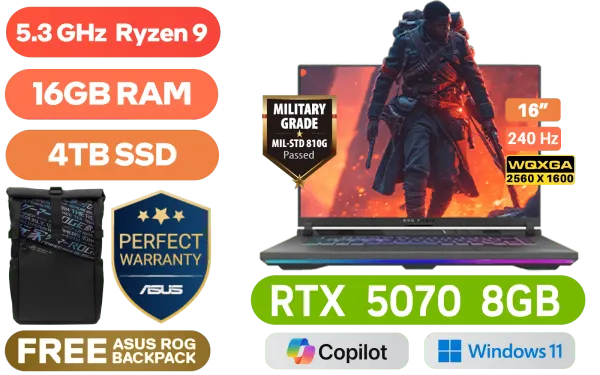ASUS ROG Strix G16 AMD Ryzen 9 8940HX up to 5.3GHz Processor, 80MB Cache, 16x Cores, 32x Threads / 16GB DDR5 RAM / 4TB Ultra-Fast NVMe SSD / 16" WQXGA (2560 x 1600) 240Hz Anti-Glare IPS-Level Display / NVIDIA 50 Series GeForce RTX 5070 8GB GDDR7 Dedicated Graphics Card / Windows 11 Home (64bit) / MediaTek Wi-Fi 6E MT7922 Wireless LAN / Bluetooth 5.3 / 1080P FHD Camera / 2 x USB Type-A / 2x Type-C (Supports for DisplayPort™ / Power Delivery / G-SYNC) / 1 x HDMI / 1 x Headphone & Microphone Audio Combo Jack / 1x RJ45 / Per-Key RGB Backlit Keyboard / 2x Speakers with Dolby Atmos / + FREE ASUS ROG Bag / ASUS ROG Strix G16 G614PP Ryzen 9 RTX 5070 Gaming Laptop DealASUS ROG Strix G16 AMD Ryzen 9 8940HX up to 5.3GHz Processor, 80MB Cache, 16x Cores, 32x Threads / 16GB DDR5 RAM / 4TB Ultra-Fast NVMe SSD / 16" WQXGA (2560 x 1600) 240Hz Anti-Glare IPS-Level Display / NVIDIA 50 Series GeForce RTX 5070 8GB GDDR7 Dedicated Graphics Card / Windows 11 Home (64bit) / MediaTek Wi-Fi 6E MT7922 Wireless LAN / Bluetooth 5.3 / 1080P FHD Camera / 2 x USB Type-A / 2x Type-C (Supports for DisplayPort™ / Power Delivery / G-SYNC) / 1 x HDMI / 1 x Headphone & Microphone Audio Combo Jack / 1x RJ45 / Per-Key RGB Backlit Keyboard / 2x Speakers with Dolby Atmos / + FREE ASUS ROG Bag / ASUS ROG Strix G16 G614PP Ryzen 9 RTX 5070 Gaming Laptop Deal [G614PP-91610GR0W/4TB] / 3 YEARS WARRANTY / [+] Get Crimson Desert with select AMD Mobile products+ FREE DELIVERY !