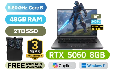 ASUS ROG Strix G16 Intel Core i9 14900HX up to 5.80GHz Processor, 36MB Cache, 24x Cores, 32x Threads / 48GB DDR5 RAM / 2TB Ultra-Fast NVMe SSD / 16" WQXGA (2560 x 1600) 240Hz Refresh Rate Anti-Glare IPS-Level ROG Nebula Display / NVIDIA 50 Series GeForce RTX 5060 8GB GDDR7 Graphics Card / Windows 11 Home (64bit) / 1080P FHD IR Camera / Intel Wi-Fi 7 BE200 Wireless LAN / Bluetooth 5.4 / 3 x USB Type-A / 2x USB Type-C / 1 x HDMI / 1 x Headphone and Microphone Audio Combo Jack / 1x RJ-45 / Per-Key RGB Backlit Keyboard / Dolby Atmos Audio with Smart Amp Technology / FREE ASUS ROG Backpack / ASUS ROG Strix G16 G615JMR Core i9 RTX 5060 Gaming Laptop DealASUS ROG Strix G16 Intel Core i9 14900HX up to 5.80GHz Processor, 36MB Cache, 24x Cores, 32x Threads / 48GB DDR5 RAM / 2TB Ultra-Fast NVMe SSD / 16" WQXGA (2560 x 1600) 240Hz Refresh Rate Anti-Glare IPS-Level ROG Nebula Display / NVIDIA 50 Series GeForce RTX 5060 8GB GDDR7 Graphics Card / Windows 11 Home (64bit) / 1080P FHD IR Camera / Intel Wi-Fi 7 BE200 Wireless LAN / Bluetooth 5.4 / 3 x USB Type-A / 2x USB Type-C / 1 x HDMI / 1 x Headphone and Microphone Audio Combo Jack / 1x RJ-45 / Per-Key RGB Backlit Keyboard / Dolby Atmos Audio with Smart Amp Technology / FREE ASUS ROG Backpack / ASUS ROG Strix G16 G615JMR Core i9 RTX 5060 Gaming Laptop Deal [G615JMR-I91610G0W/48GB/2TB] / 3 YEARS WARRANTY + FREE DELIVERY !