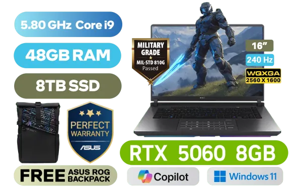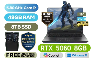 ASUS ROG Strix G16 Intel Core i9 14900HX up to 5.80GHz Processor, 36MB Cache, 24x Cores, 32x Threads / 48GB DDR5 RAM / 8TB Ultra-Fast NVMe SSD / 16" WQXGA (2560 x 1600) 240Hz Refresh Rate Anti-Glare IPS-Level ROG Nebula Display / NVIDIA 50 Series GeForce RTX 5060 8GB GDDR7 Graphics Card / Windows 11 Home (64bit) / 1080P FHD IR Camera / Intel Wi-Fi 7 BE200 Wireless LAN / Bluetooth 5.4 / 3 x USB Type-A / 2x USB Type-C / 1 x HDMI / 1 x Headphone and Microphone Audio Combo Jack / 1x RJ-45 / Per-Key RGB Backlit Keyboard / Dolby Atmos Audio with Smart Amp Technology / FREE ASUS ROG Backpack / ASUS ROG Strix G16 G615JMR Core i9 RTX 5060 Gaming Laptop DealASUS ROG Strix G16 Intel Core i9 14900HX up to 5.80GHz Processor, 36MB Cache, 24x Cores, 32x Threads / 48GB DDR5 RAM / 8TB Ultra-Fast NVMe SSD / 16" WQXGA (2560 x 1600) 240Hz Refresh Rate Anti-Glare IPS-Level ROG Nebula Display / NVIDIA 50 Series GeForce RTX 5060 8GB GDDR7 Graphics Card / Windows 11 Home (64bit) / 1080P FHD IR Camera / Intel Wi-Fi 7 BE200 Wireless LAN / Bluetooth 5.4 / 3 x USB Type-A / 2x USB Type-C / 1 x HDMI / 1 x Headphone and Microphone Audio Combo Jack / 1x RJ-45 / Per-Key RGB Backlit Keyboard / Dolby Atmos Audio with Smart Amp Technology / FREE ASUS ROG Backpack / ASUS ROG Strix G16 G615JMR Core i9 RTX 5060 Gaming Laptop Deal [G615JMR-I91610G0W/48GB/8TB] / 3 YEARS WARRANTY + FREE DELIVERY !