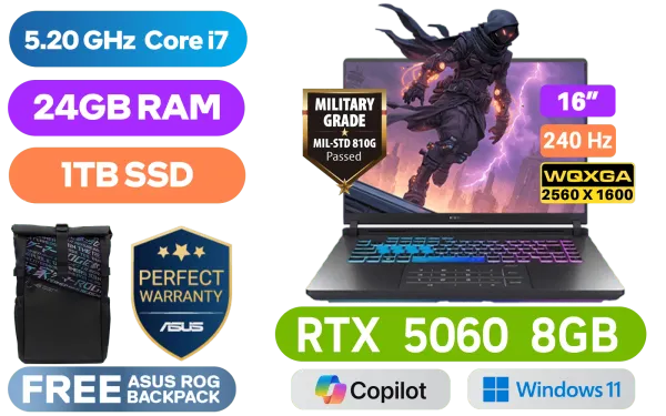 [G-SYNC] ASUS ROG Strix G16 Intel Core i7-14650HX up to 5.20GHz Processor, 30MB Cache, 16x Cores, 24x Threads / 24GB DDR5 RAM / 1TB Ultra-Fast NVMe SSD / 16" WQXGA (2560 x 1600) 240Hz Anti-Glare IPS Display / NVIDIA 50 Series GeForce RTX 5060 8GB GDDR7 Graphics Card / 1080P FHD IR Camera / Windows 11 Home (64bit) / Intel Wi-Fi 7 BE200 Wireless LAN / Bluetooth 5.4 / 3 x USB Type-A / 2x USB Type-C (Thunderbolt™ 4, DisplayPort™ / power delivery) / 1 x HDMI / 1 x Headphone and Microphone Audio Combo Jack / 1x RJ-45 / RGB Backlit Keyboard / Dolby Atmos Audio with Smart Amp Technology / FREE ASUS ROG Backpack / ASUS ROG Strix G16 G615JMR Core i7 RTX 5060 Gaming Laptop Deal[G-SYNC] ASUS ROG Strix G16 Intel Core i7-14650HX up to 5.20GHz Processor, 30MB Cache, 16x Cores, 24x Threads / 24GB DDR5 RAM / 1TB Ultra-Fast NVMe SSD / 16" WQXGA (2560 x 1600) 240Hz Anti-Glare IPS Display / NVIDIA 50 Series GeForce RTX 5060 8GB GDDR7 Graphics Card / 1080P FHD IR Camera / Windows 11 Home (64bit) / Intel Wi-Fi 7 BE200 Wireless LAN / Bluetooth 5.4 / 3 x USB Type-A / 2x USB Type-C (Thunderbolt™ 4, DisplayPort™ / power delivery) / 1 x HDMI / 1 x Headphone and Microphone Audio Combo Jack / 1x RJ-45 / RGB Backlit Keyboard / Dolby Atmos Audio with Smart Amp Technology / FREE ASUS ROG Backpack / ASUS ROG Strix G16 G615JMR Core i7 RTX 5060 Gaming Laptop Deal [G615JMR-I71610G0W/24GB] / 3 YEARS WARRANTY + FREE DELIVERY !